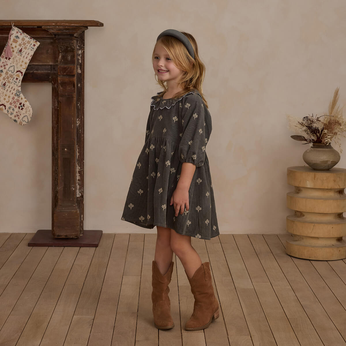 Freya Dress in Forest Floral by Rylee & Cru. The Freya dress dress is made of fine corduroy with playful ruffle collar and balloon sleeves. Zipper back closure.