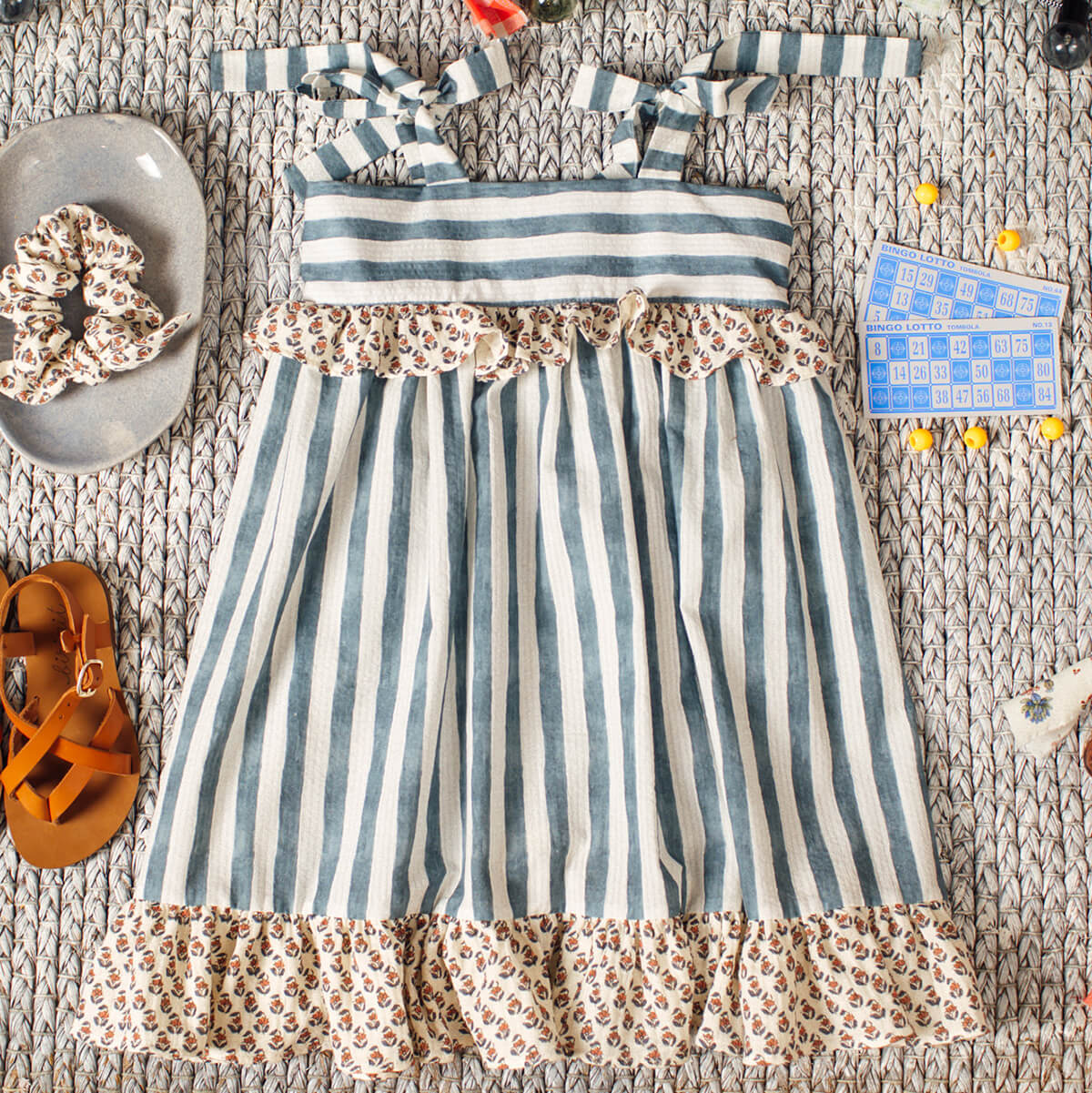 Plazuela midi dress by Birinit Petit. Striped dress with contrast ruffle detail and shoulder ties.