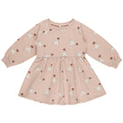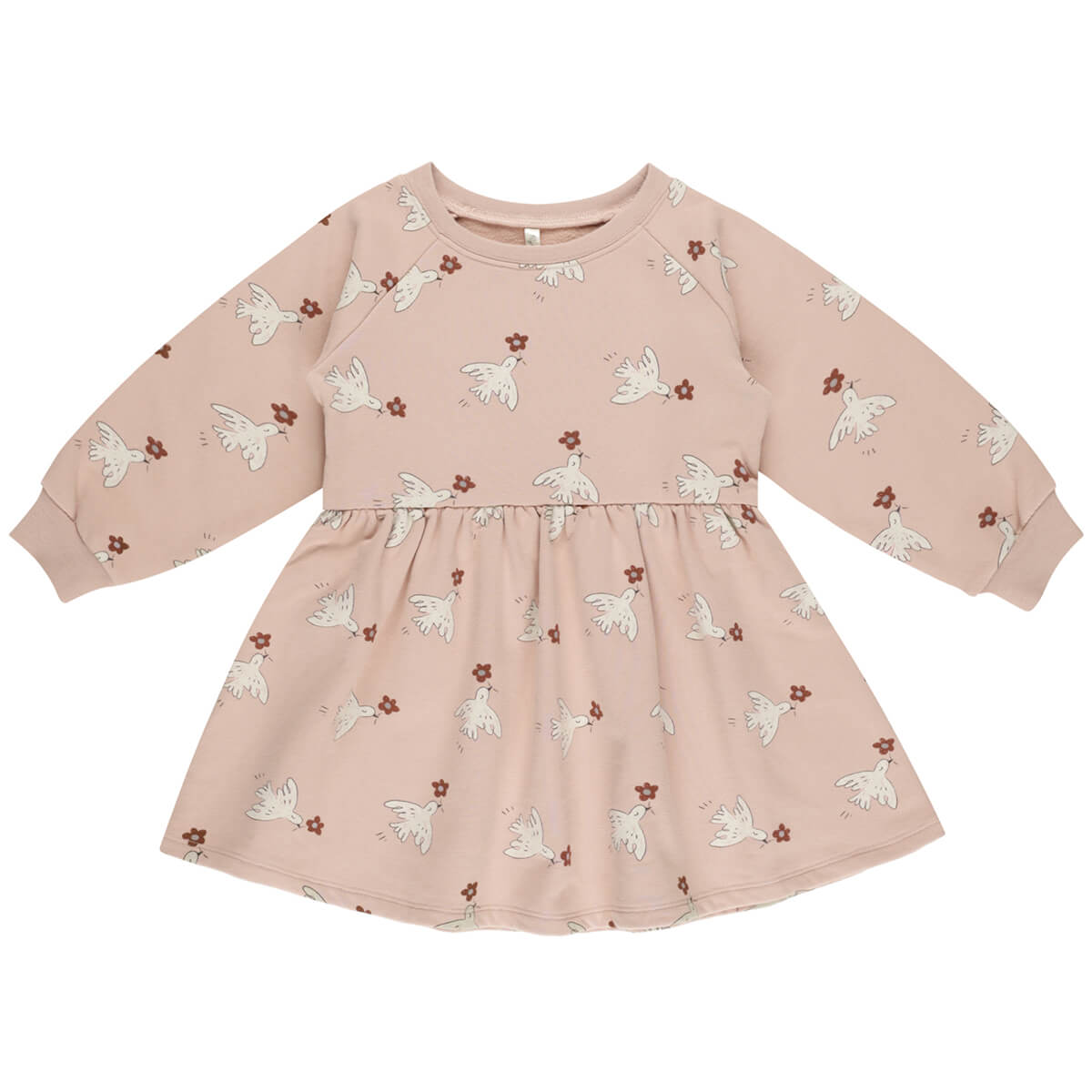 Raglan Dress by Rylee & Cru. Long sleeve raglan sweatshirt dress featuring an all-over print. Easy pullover style with ribbed at sleeve openings and neckline, and a gathered skirt.