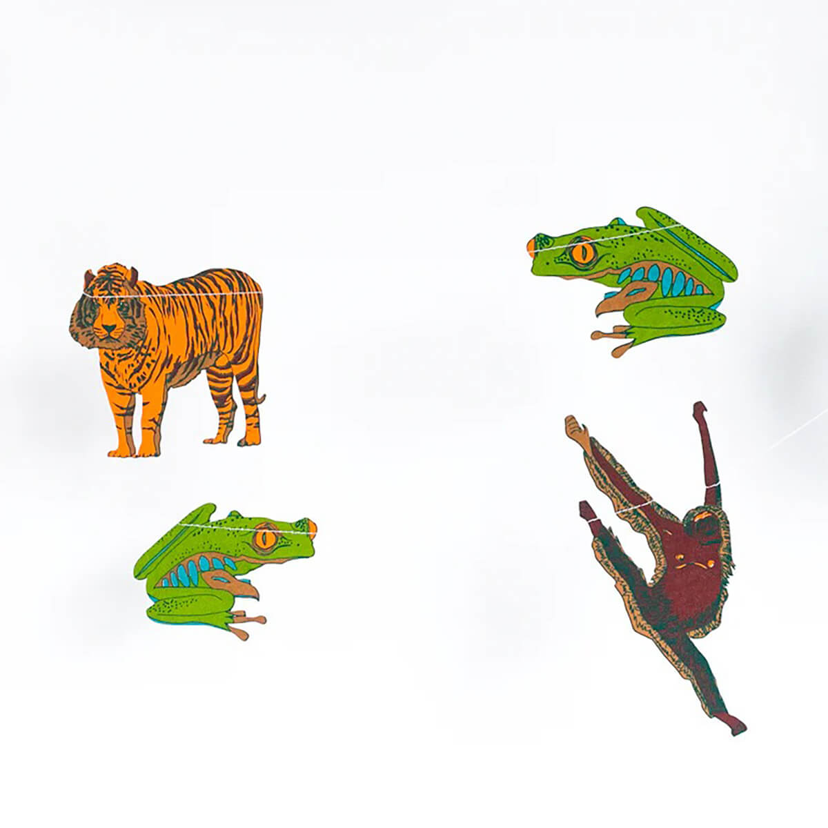 Jungle Animals paper garland by East End Press. Hand printed three metre long paper garland, featuring ten screen printed paper shapes of different jungle animals. The garland is hand printed on both sides on thick, hand made cotton paper. The shapes are sewn in a random order along strong cotton thread, with hanging loops either end, meaning the garland can be hung straight away.