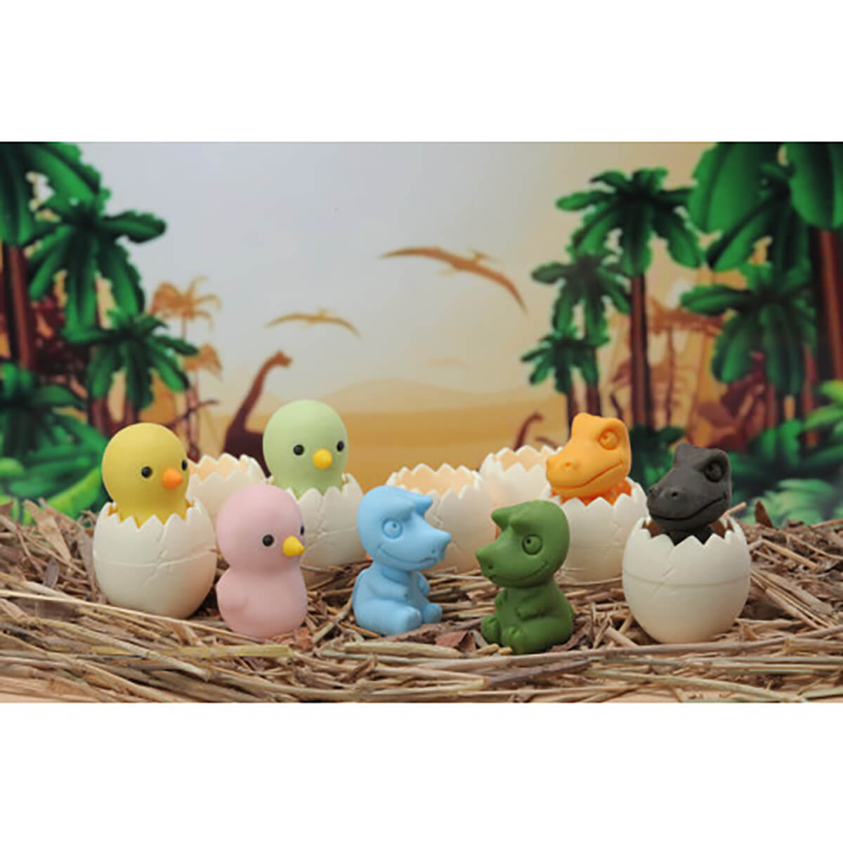 Eggs Puzzle Eraser by Iwako Japan. Cute little puzzle erasers featuring various colours of baby chicks and dinosaurs hatching from eggs. Part of Iwako's puzzle eraser collection, where the eraser parts can be taken apart and then reassembled. Designed and produced in Japan, where traditional craftsmanship and quality are unmatched. Made with nontoxic and eco-friendly materials.