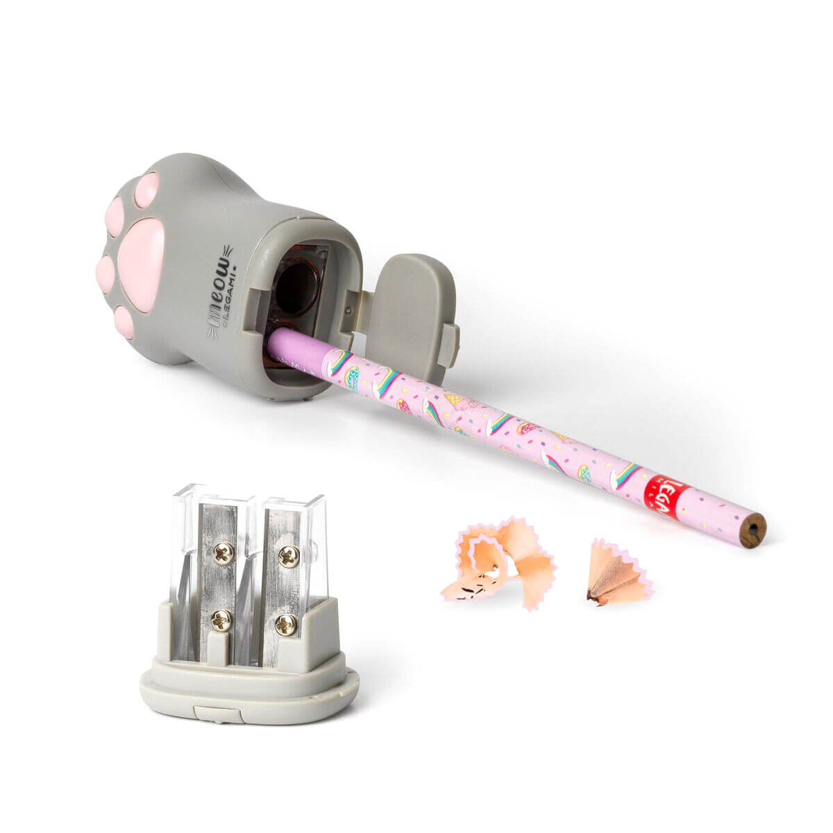 Meow Cat pencil sharpener by Legami. If your mind is sharp and your writing fierce, you had better keep your pencil sharp at all times! Legami’s Meow sharpener with container will help you keep your claws and lead sharp, with dual holes for standard and jumbo-sized pencils and a removable lid, cap and container for shavings. Also features a handy mirror on the back.