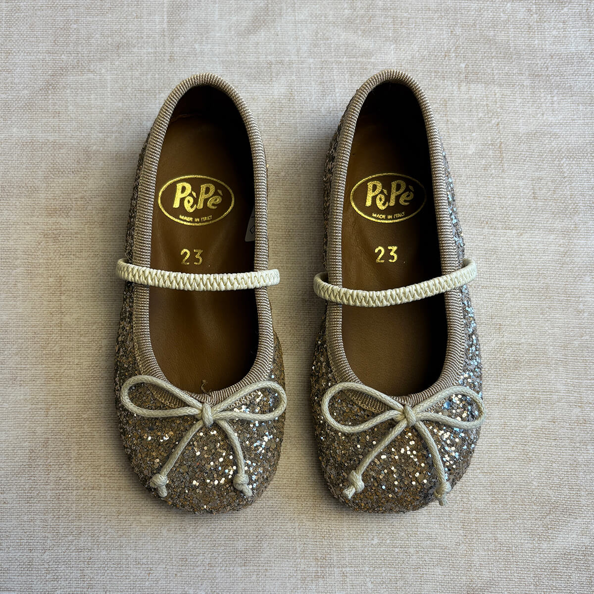 Darlyn ballet slippers by PèPè shoes. Sparkly glitter ballet slippers with a leather lining and rubber sole. Elastic strap. Handmade using traditional methods in Italy.