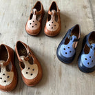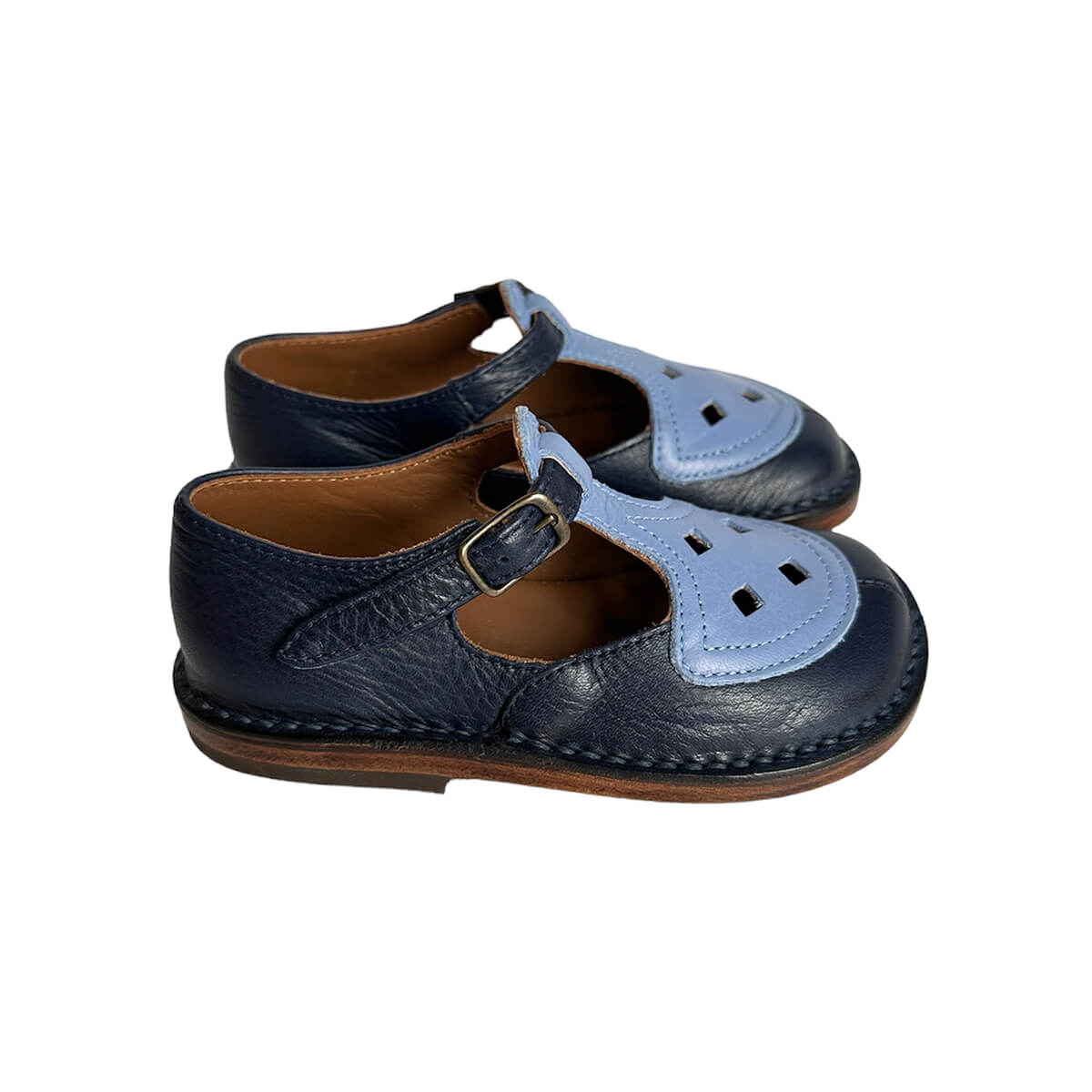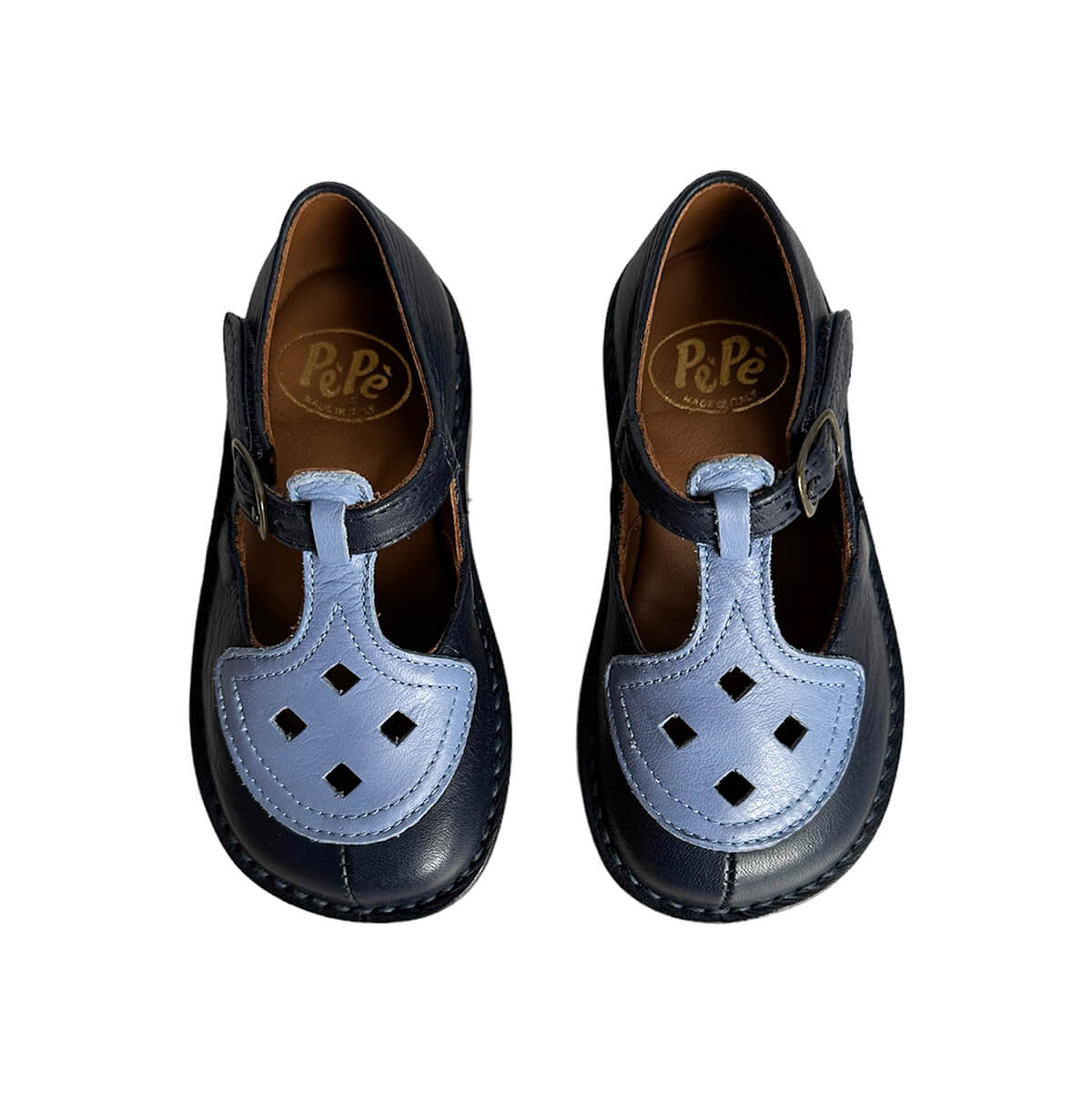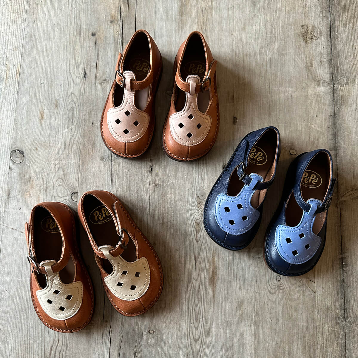 Ezra two tone cut out sandals by PèPè shoes.  Buckled T bar shoes in vegetally tanned brown leather with a contrast panel with cut out details.  Soft and flexible hand made leather sole.  Lined with 100% leather.  Handmade using traditional methods in Italy.