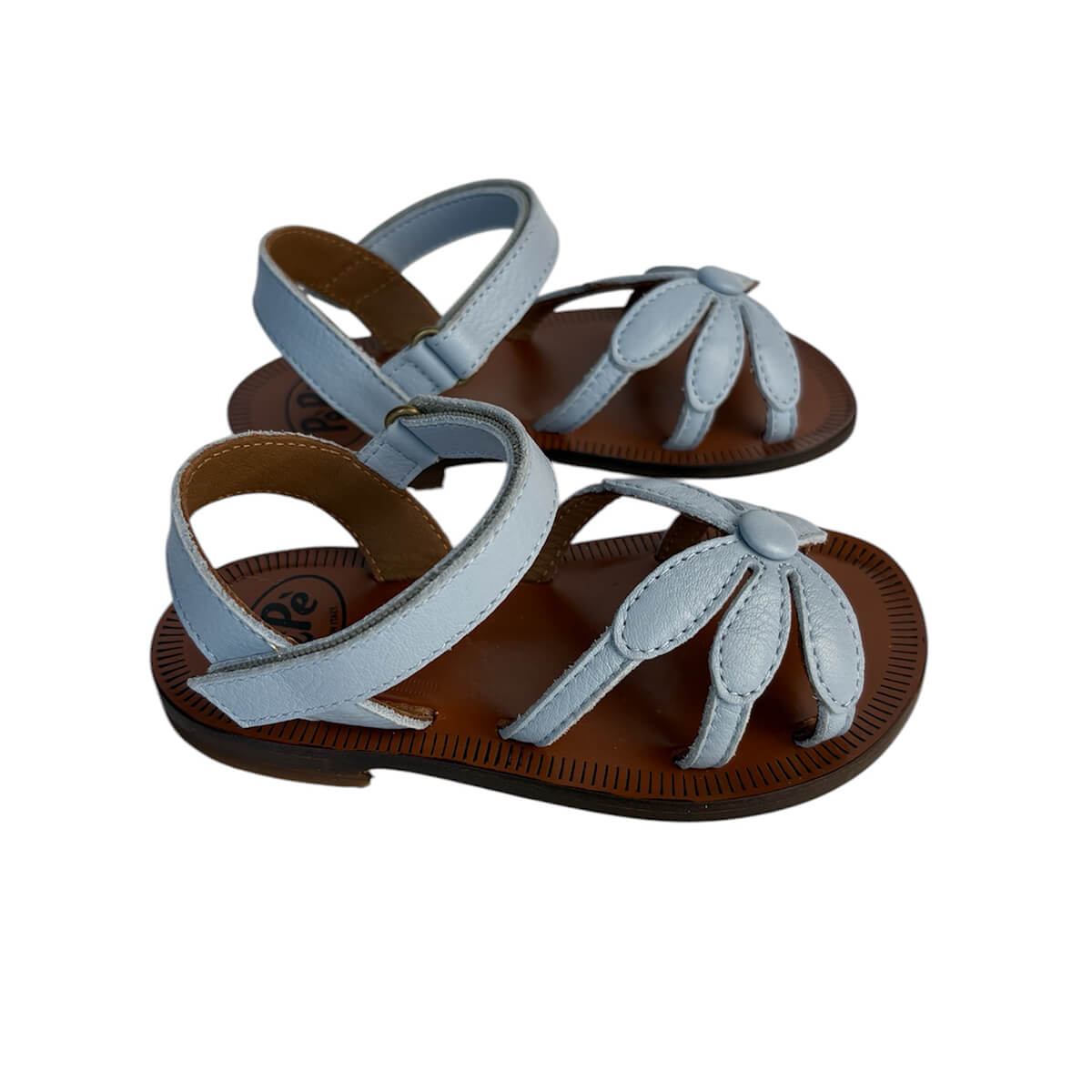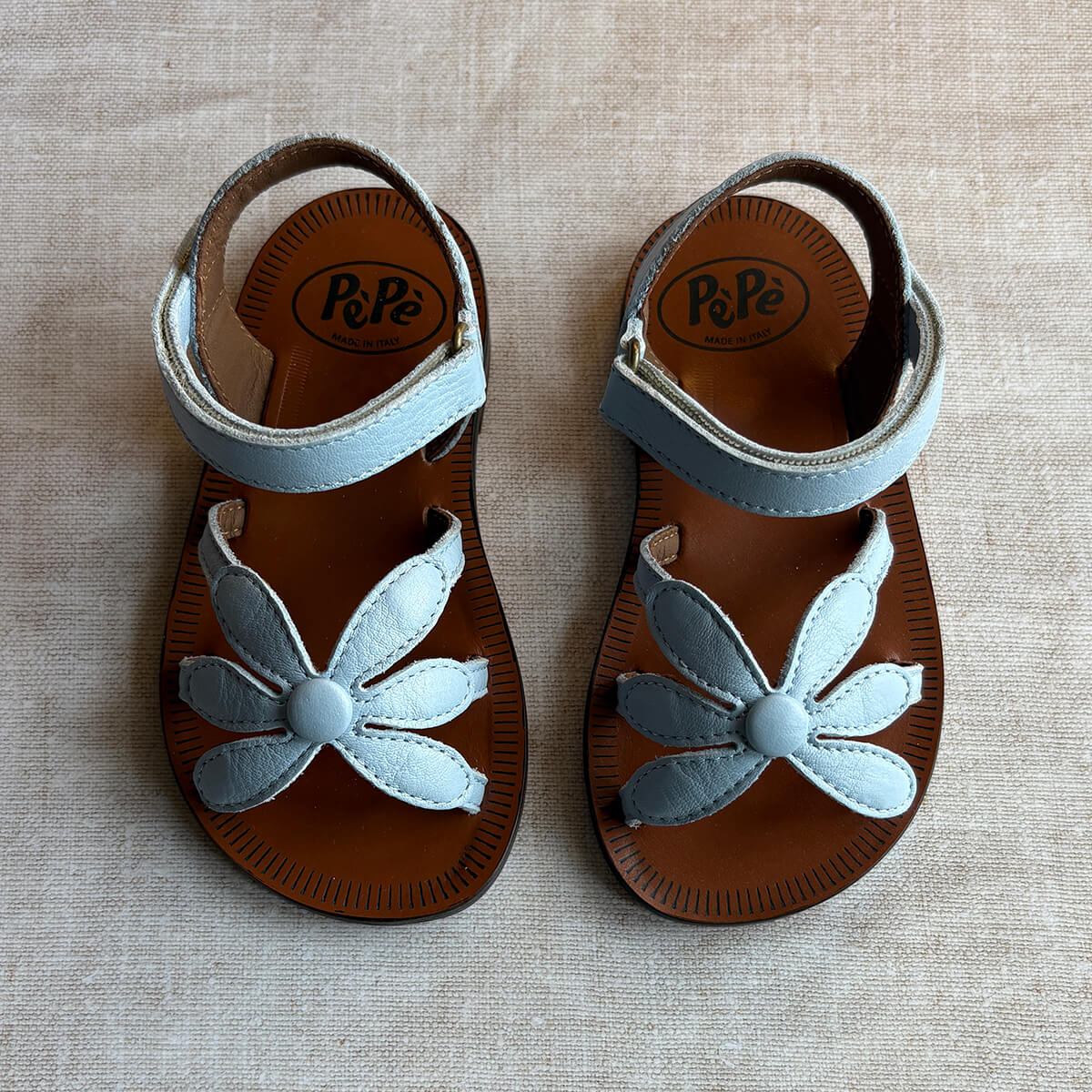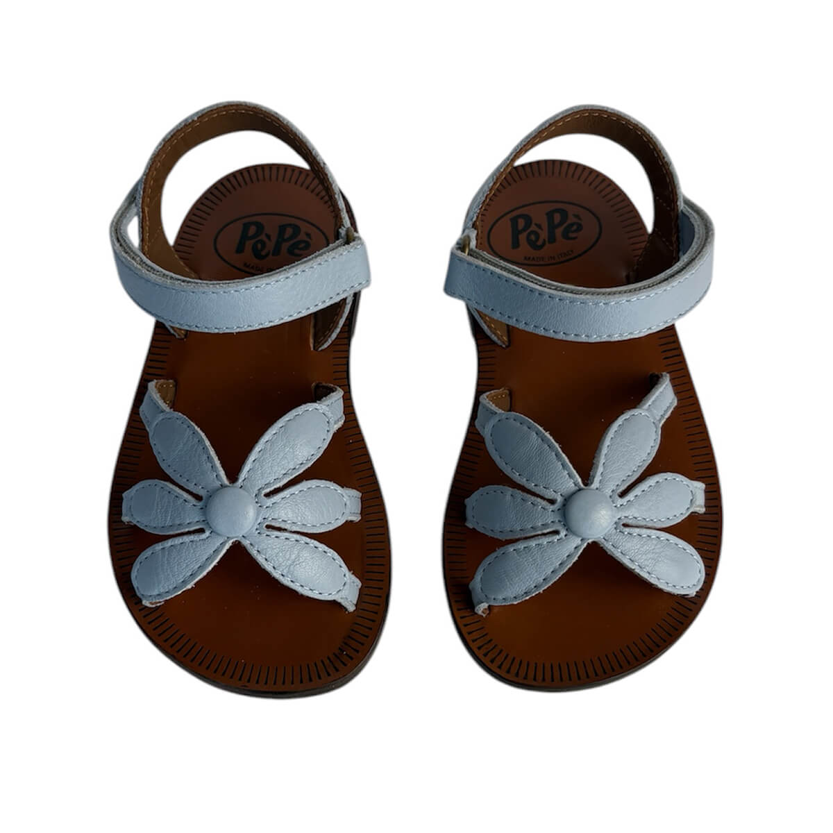 Giulia Flower sandals by PèPè shoes. Flower front sandals in a light blue soufflé leather with adjustable velcro ankle strap fastening. Soft and flexible leather sole. Lined with 100% leather. Handmade using traditional methods in Italy.
