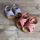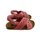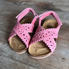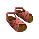 Ida crossover sandals by PèPè shoes. Two Con Me sandals in a vegetally tanned dark pink leather with cut out front cross straps and adjustable velcro sling back strap fastening. Soft and flexible anatomical cork and rubber sole. Sole lined with 100% suede leather. Handmade using traditional methods in Italy.
