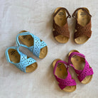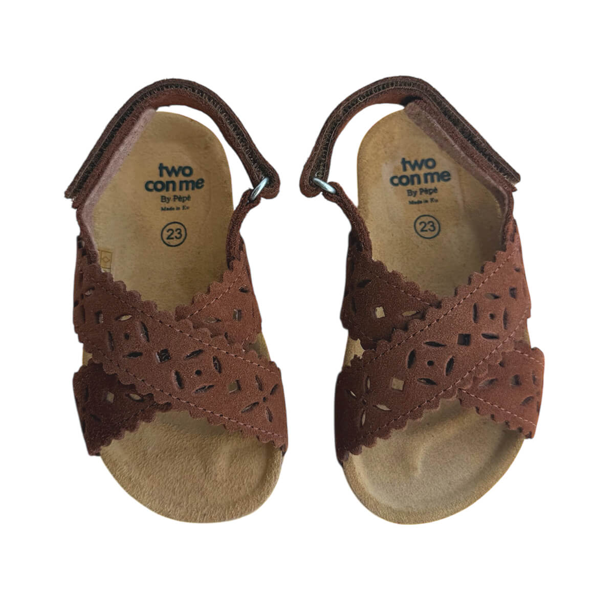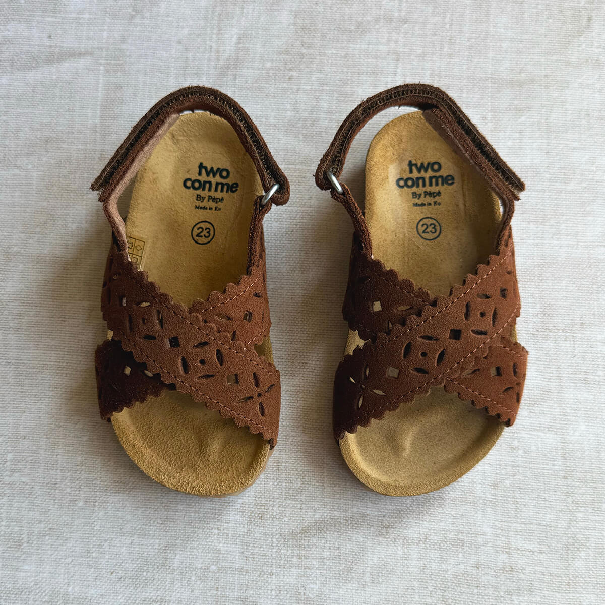 Ida crossover sandals by PèPè shoes. Two Con Me sandals in a soft suede with cut out front cross straps and adjustable velcro sling back strap fastening. Soft and flexible anatomical cork and rubber sole. Sole lined with 100% suede leather. Handmade using traditional methods in Italy.