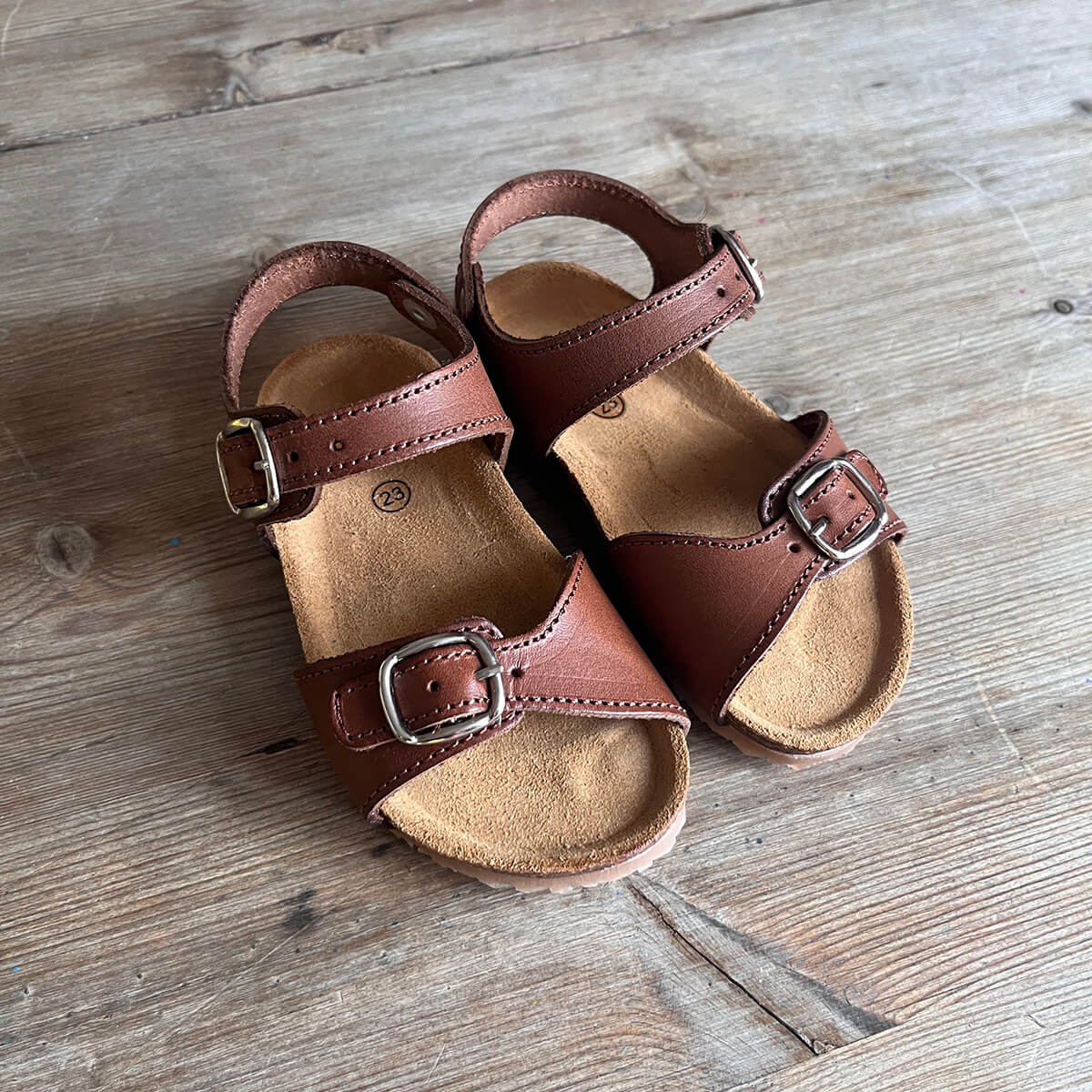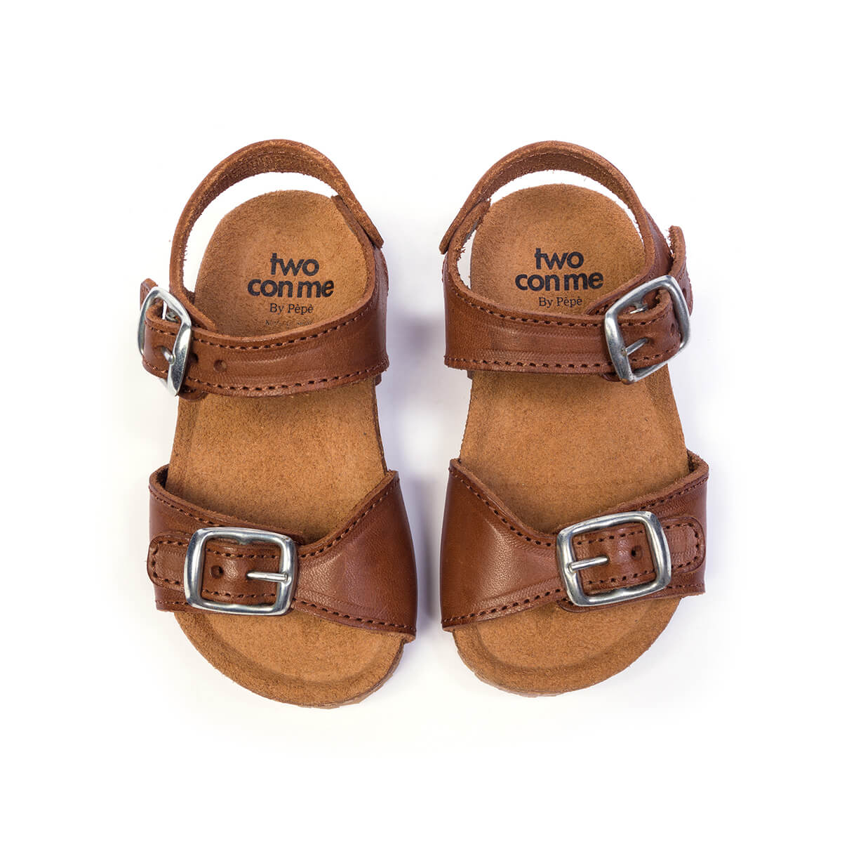 Joyce buckle sandals by PèPè shoes. Two Con Me sandals in a vegetally tanned brown leather with silver tone buckle fastenings. Soft and flexible anatomical cork and rubber sole. Sole lined with 100% suede leather. Handmade using traditional methods in Italy.