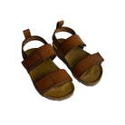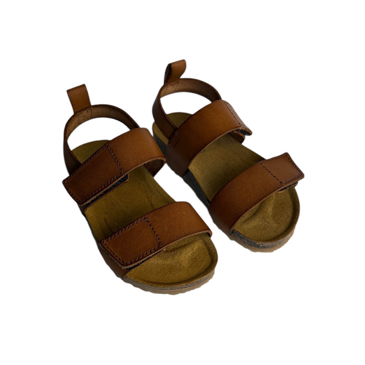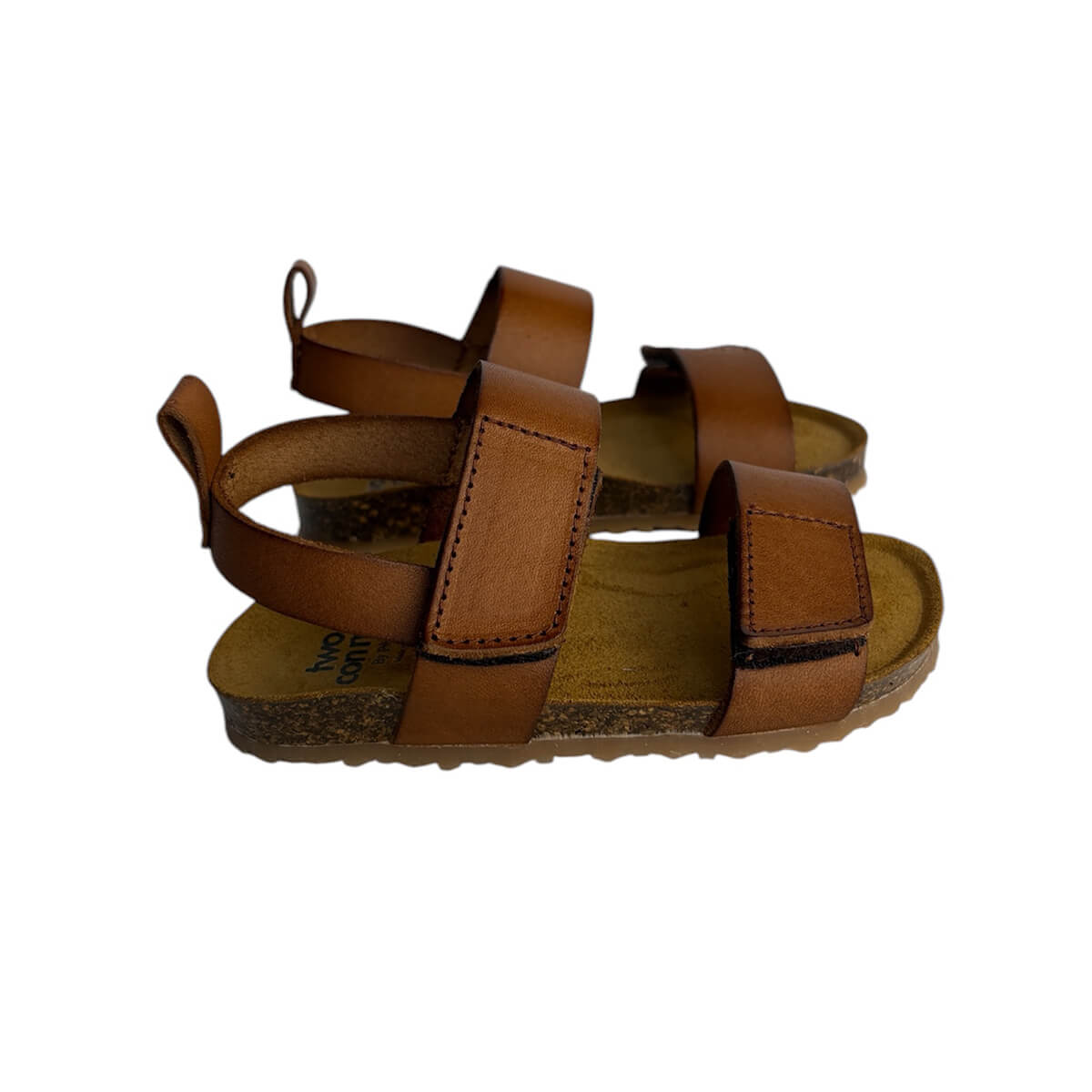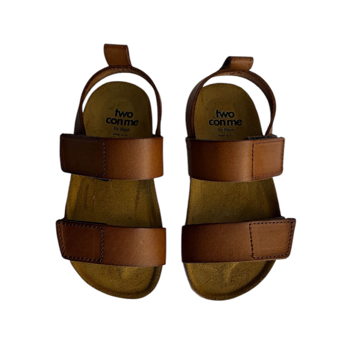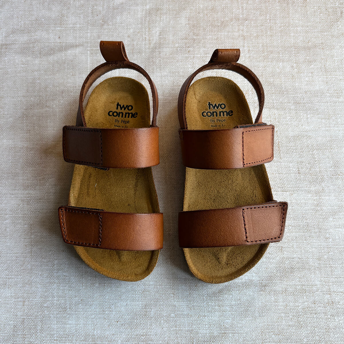 Loris velcro sandals by PèPè shoes. Two Con Me sandals in a vegetally tanned brown leather with velcro fastenings and a pull tab at the back for putting the shoe on easily. Soft and flexible anatomical cork and rubber sole. Sole lined with 100% suede leather. Handmade using traditional methods in Italy.