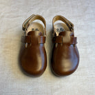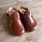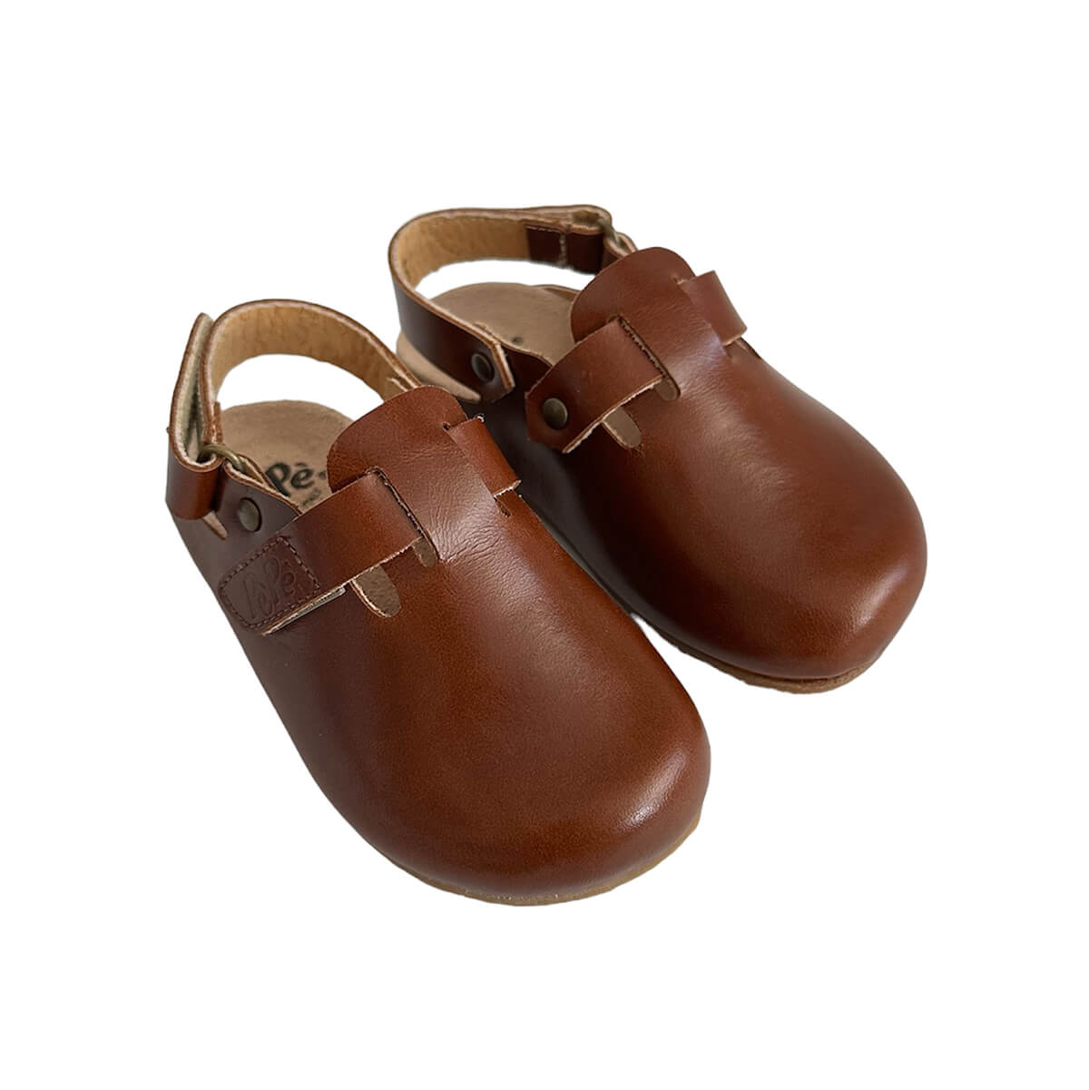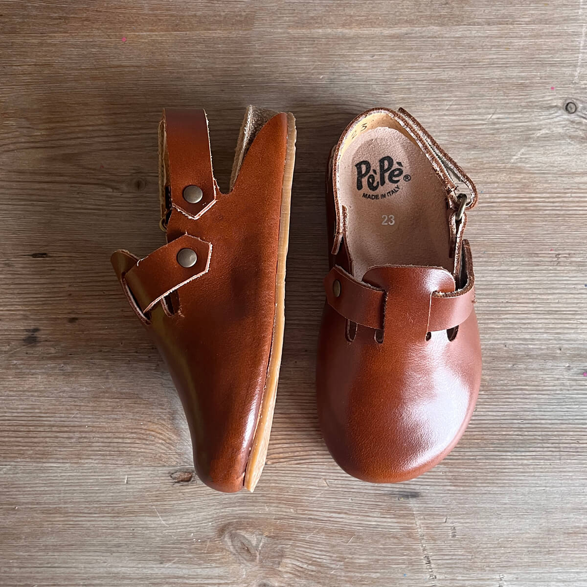 Lucio leather clogs by PèPè shoes. Soft leather clogs with a leather lining and rubber sole. Fully adjustable with a velcro adjustable slingback fastening. Handmade using traditional methods in Italy.