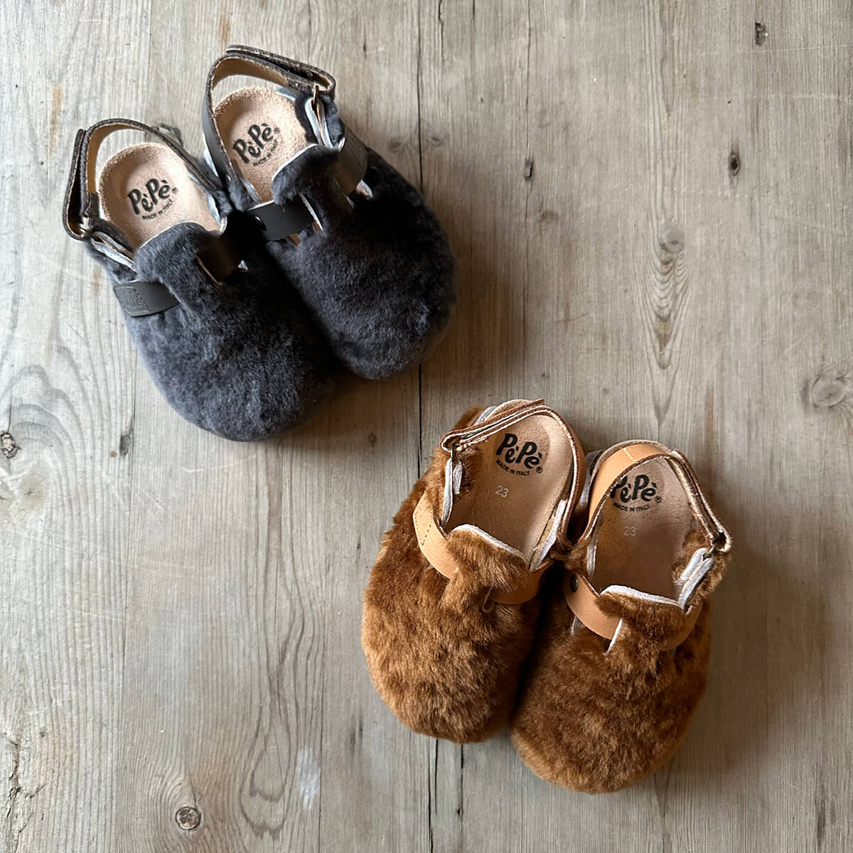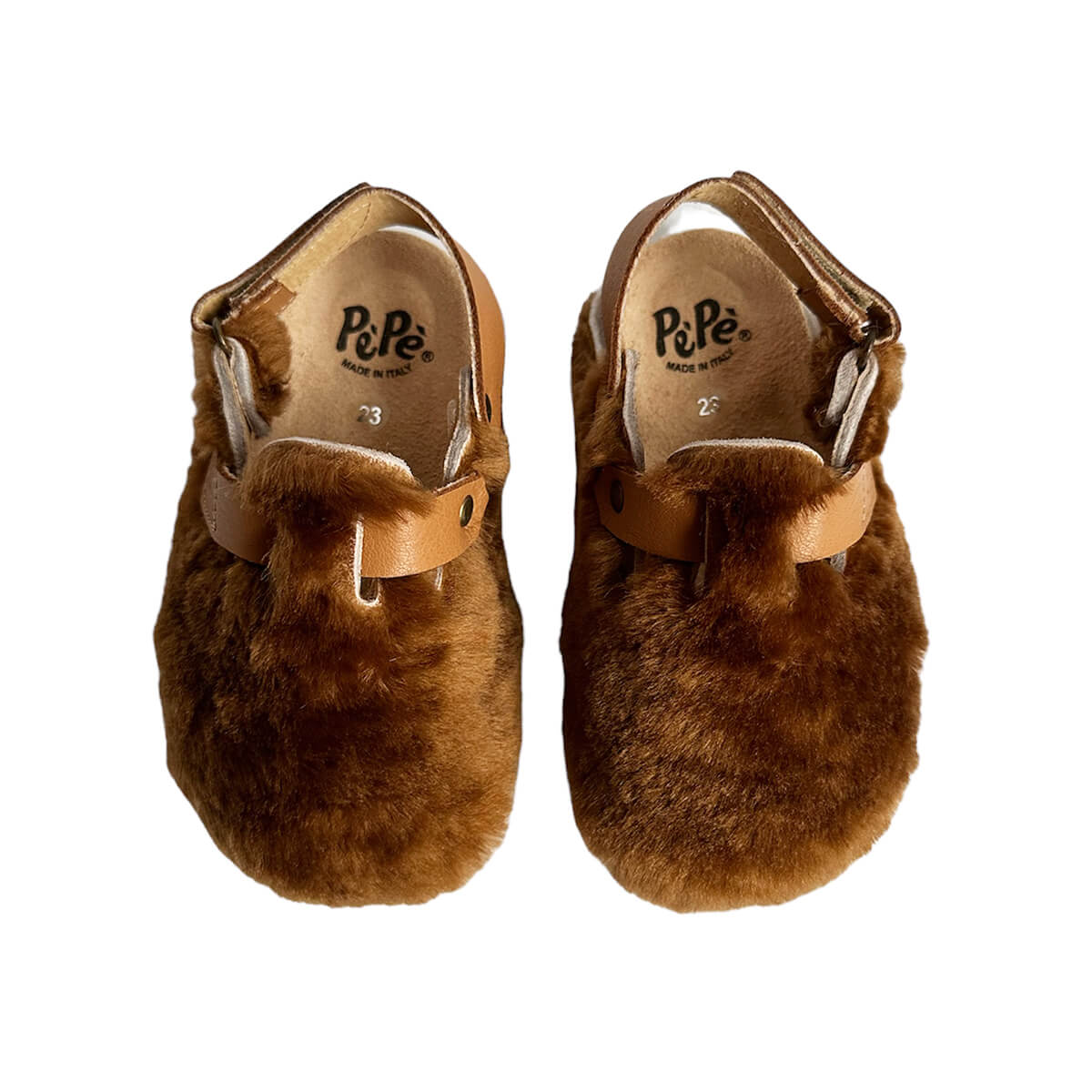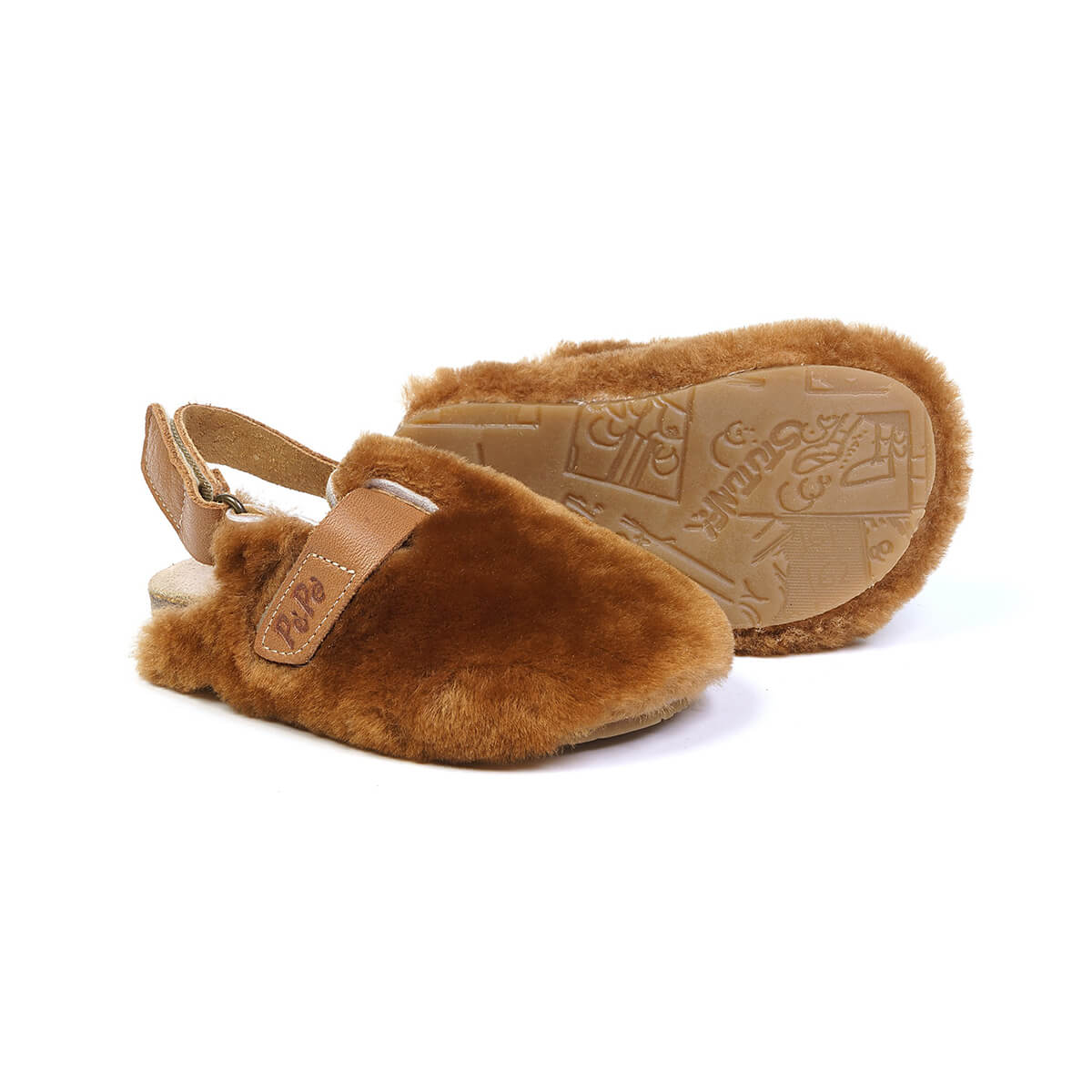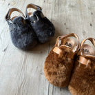 Lucio shearling clogs by PèPè shoes. Soft shearling clogs with a leather lining and rubber sole. Fully adjustable with a velcro adjustable slingback fastening. Handmade using traditional methods in Italy.
