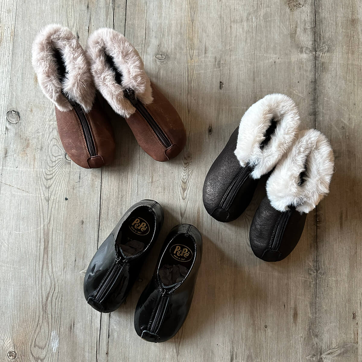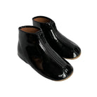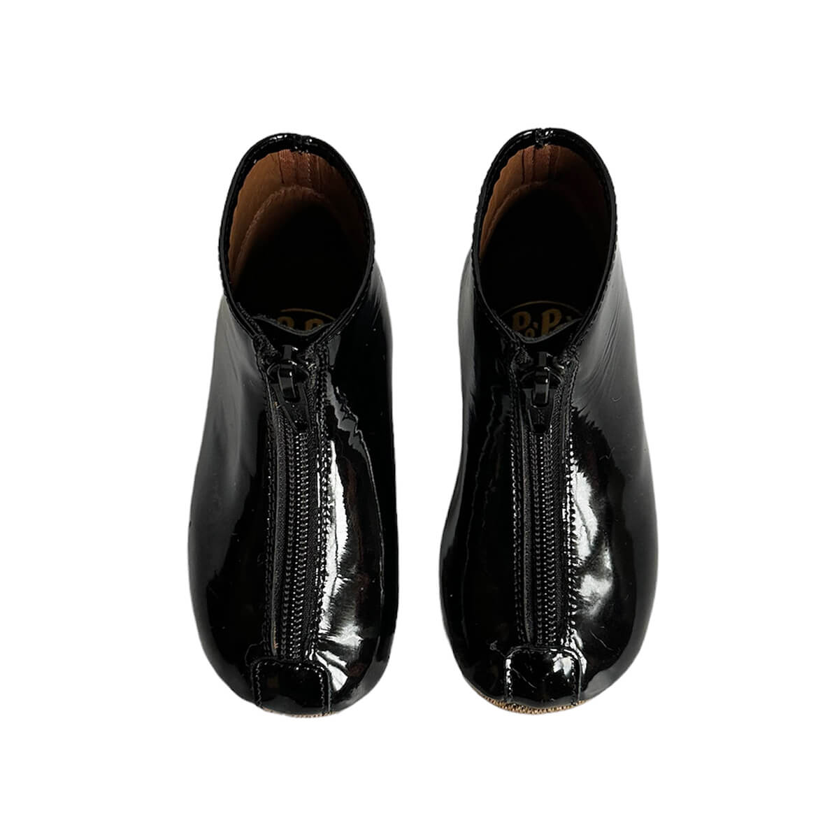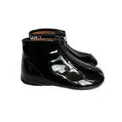 Patent leather booties by PèPè shoes. Shiny patent leather zip up boots with a leather lining and flat rubber sole. Handmade using traditional methods in Italy.