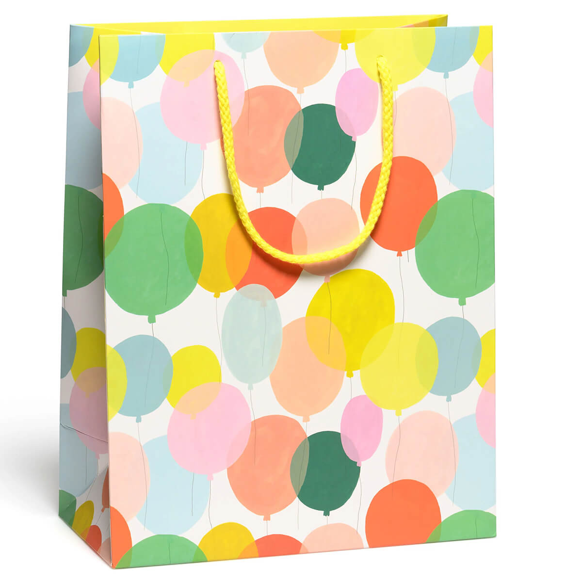 Birthday balloons large gift bag by Red Cap Cards. Features a design by Kate Pugsley. Made from heavyweight coated paper and finished with a cotton rope handle. The perfect gift bag for a birthday gift. Easily fits in an item of clothing, medium sized toy, book or similar gift. Printed in the USA.
