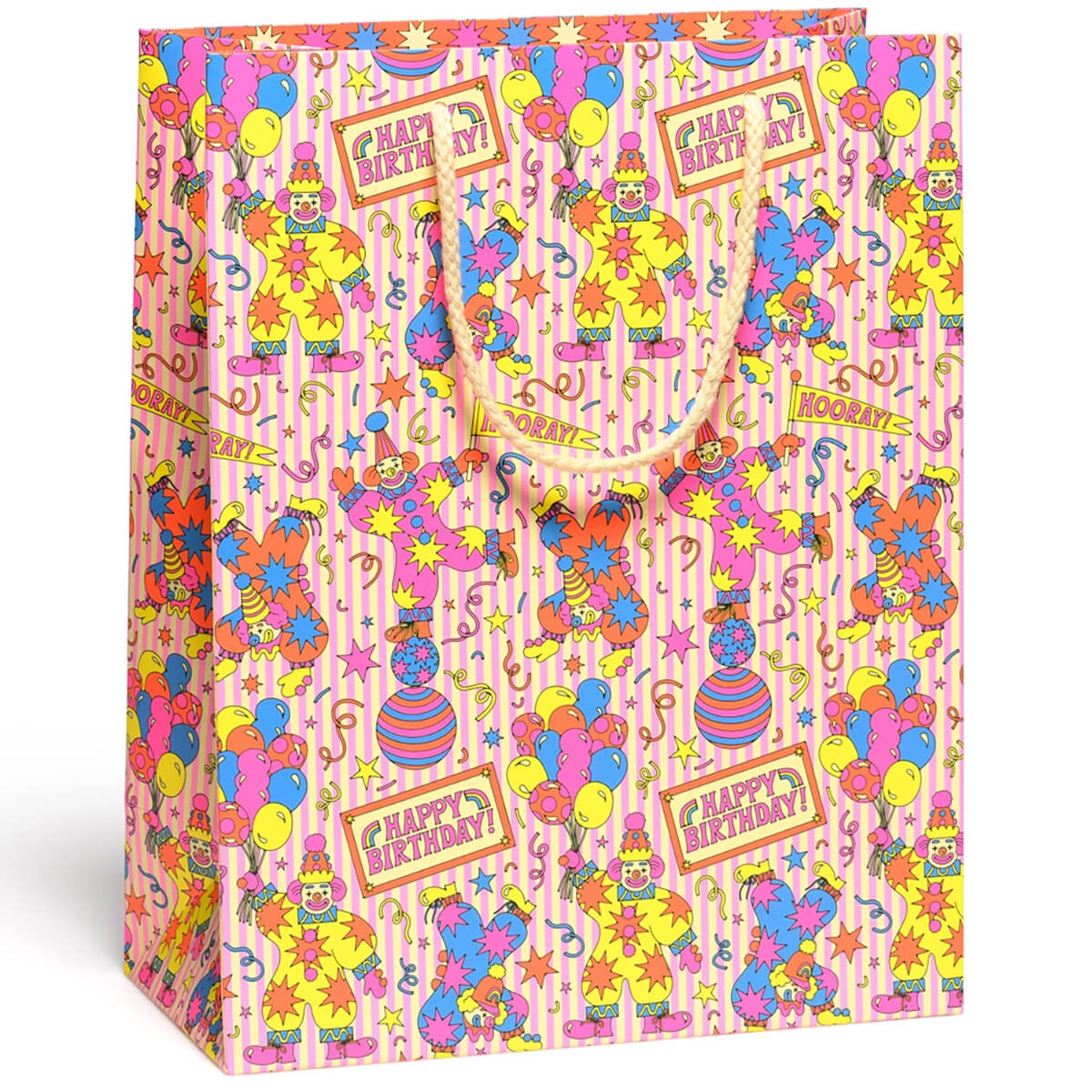 Clowns large gift bag by Red Cap Cards. Features a design by Krista Perry. Made from heavyweight coated paper and finished with a cotton rope handle. The perfect gift bag for a birthday gift. Easily fits in an item of clothing, medium sized toy, book or similar gift.