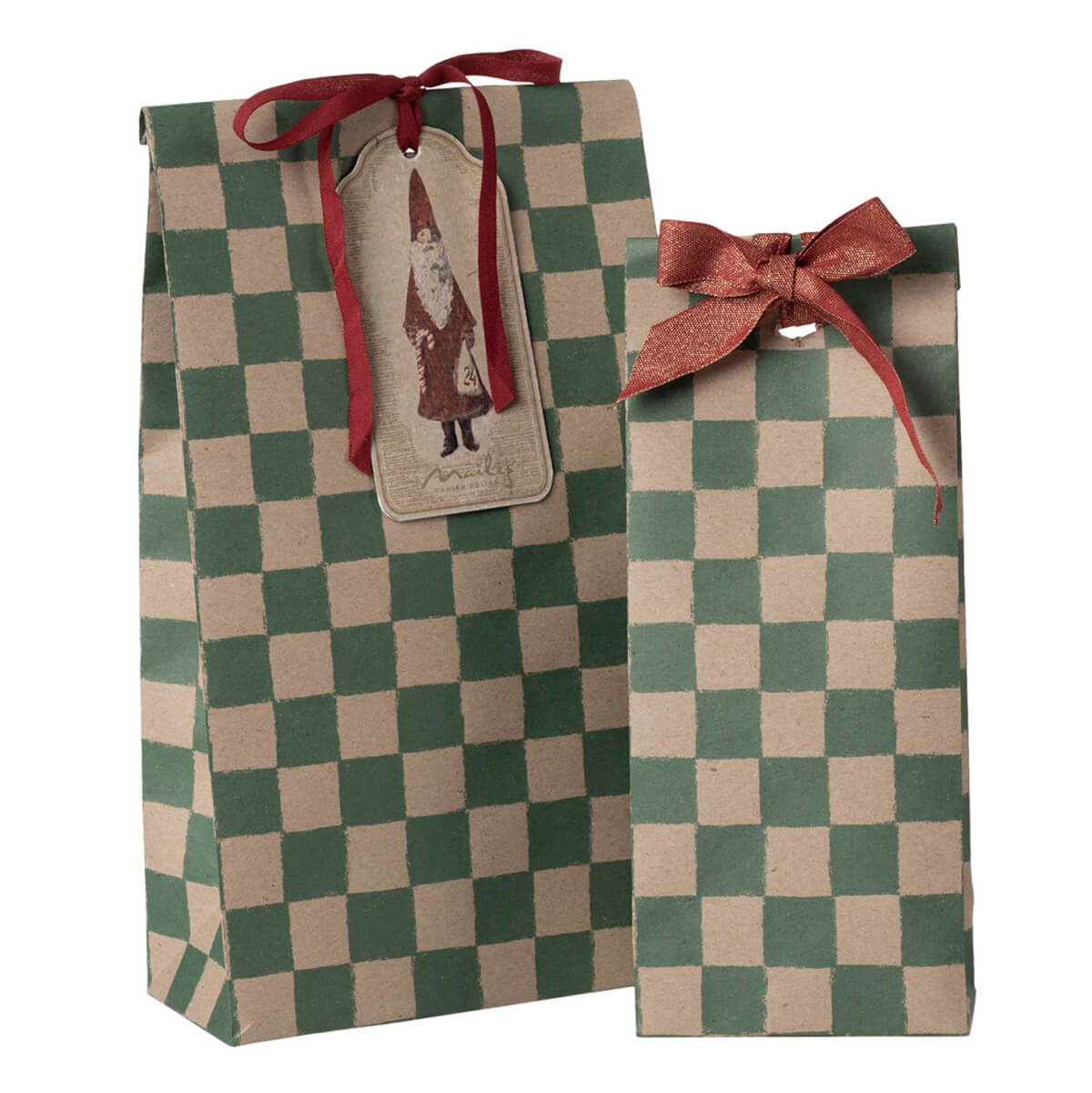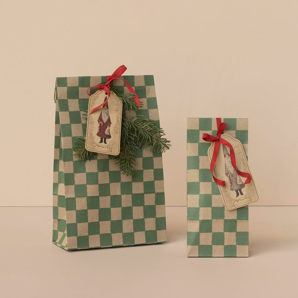 Green checker large gift bag by Maileg. Give your gifts a personal touch with this beautiful printed gift bag. Add a colorful ribbon to complete the look. It is a very easy and fast way to wrap small presents and still get a perfect look.