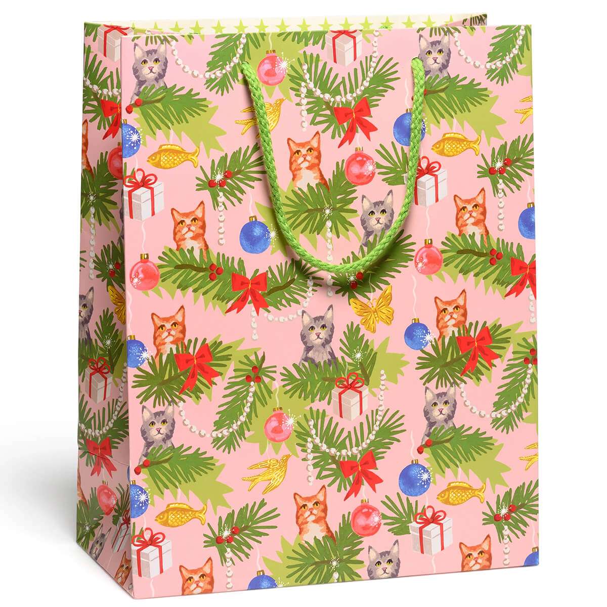 Meowy Christmas large gift bag by Red Cap Cards. Features a design by Danielle Kroll. Made from heavyweight coated paper and finished with a cotton rope handle. The perfect gift bag for a Christmas gift. Easily fits in an item of clothing, large sized toy, book or similar gift.