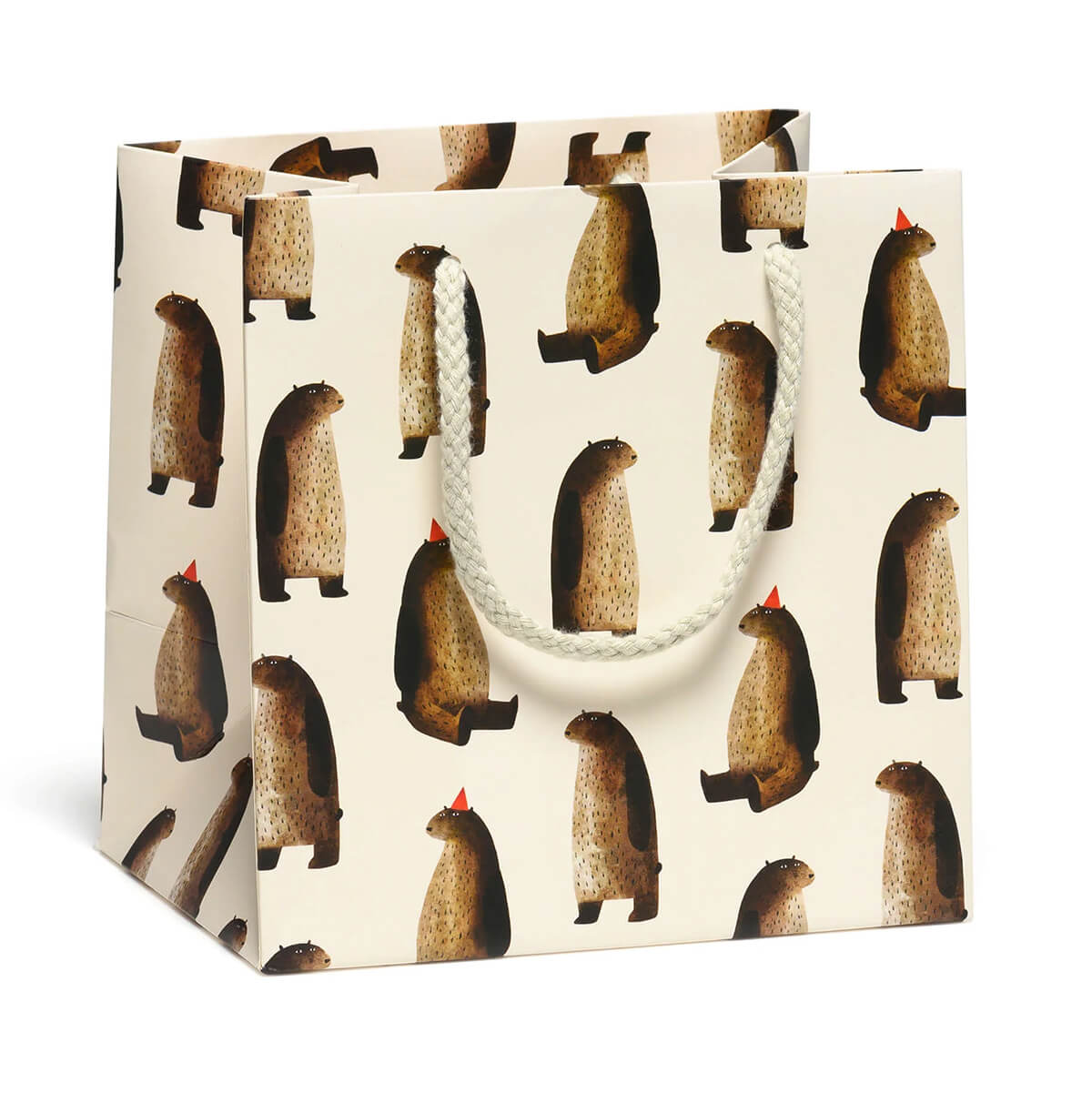 Party bears small gift bag by Red Cap Cards. Features an illustration by Jon Klassen. Made from heavyweight coated paper and finished with a cotton rope handle. The perfect gift bag for a small gift. Easily fits in a small item of clothing, small toy, book or similar gift. Printed in the USA.