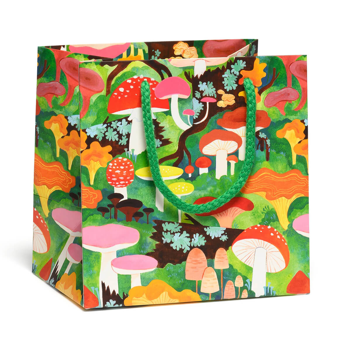 Woodland mushrooms small gift bag by Red Cap Cards. Features a design by Kelsey Garrity Riley. Made from heavyweight coated paper and finished with a cotton rope handle. The perfect gift bag for a small gift. Easily fits in a small item of clothing, small toy, book or similar gift. Printed in the USA.