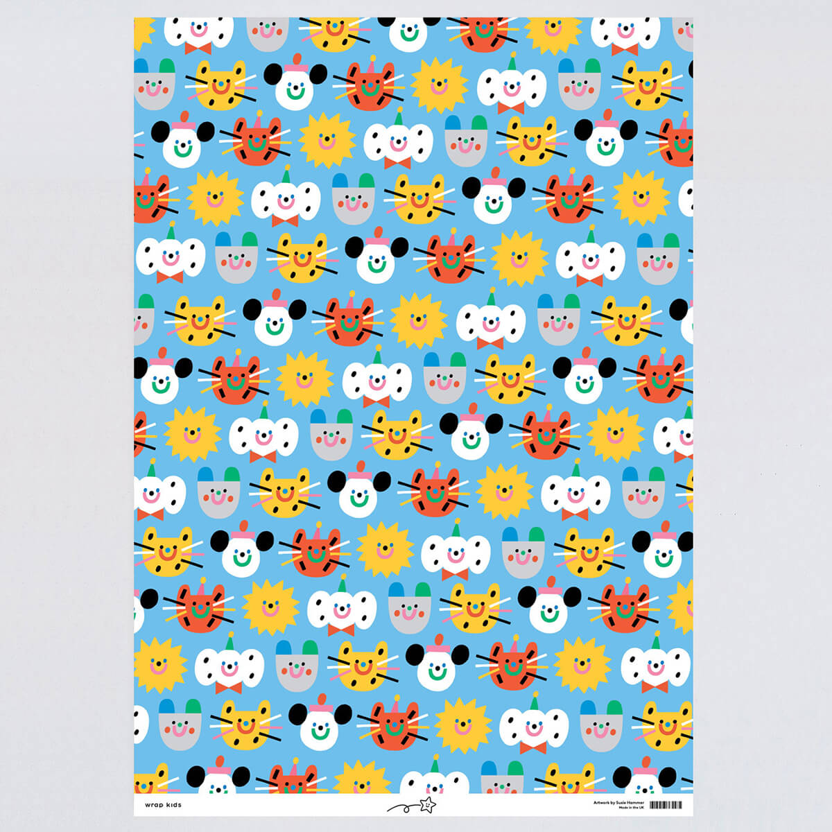 Happy Friends gift wrap by Susie Hammer for Wrap. Party hats at the ready, these beaming buddies are waiting for the fun to begin. Designed by artist Susie Hammer, this irresistibly cute and colourful wrapping paper design is sure to be a crowd pleaser. A wonderful way to wrap a special gift.