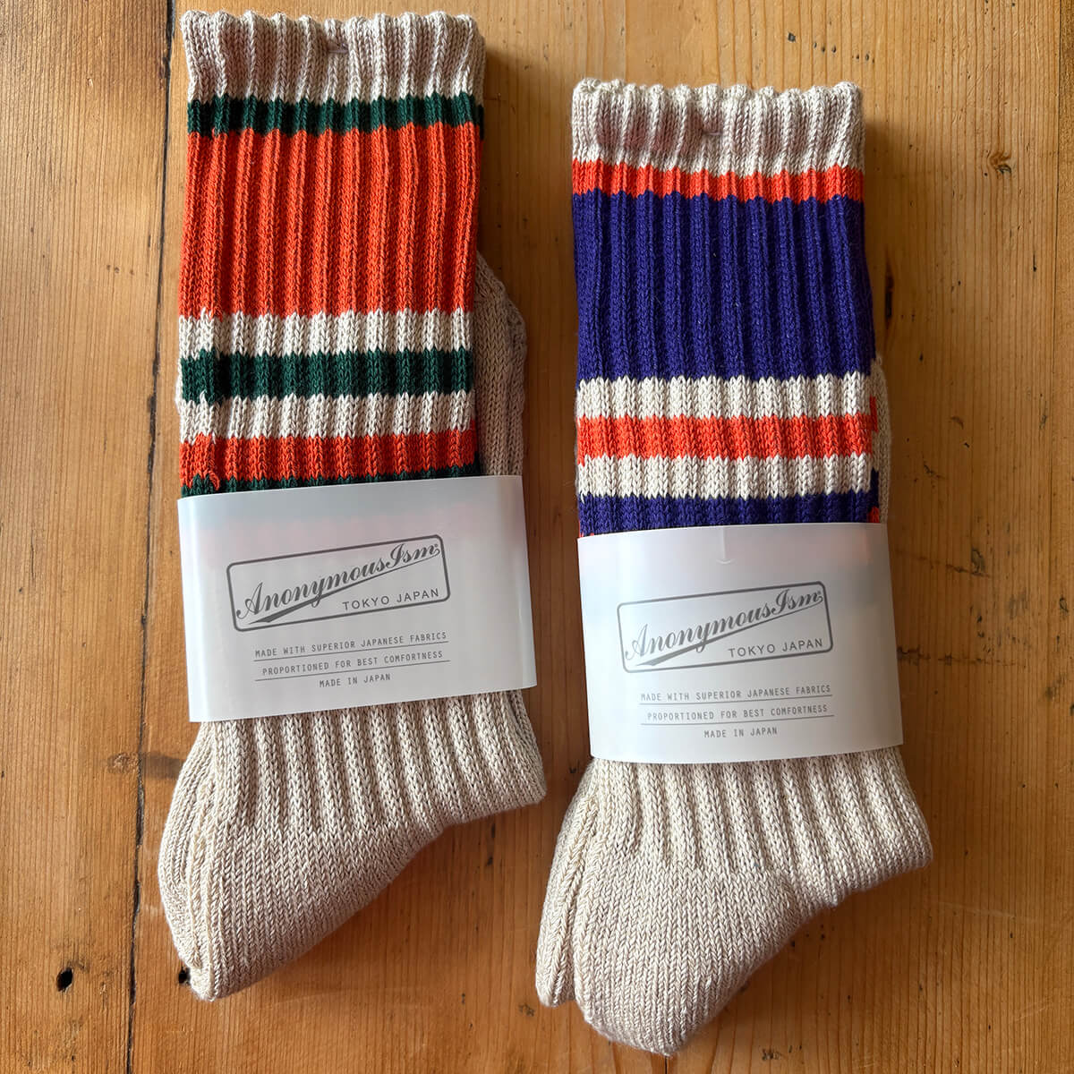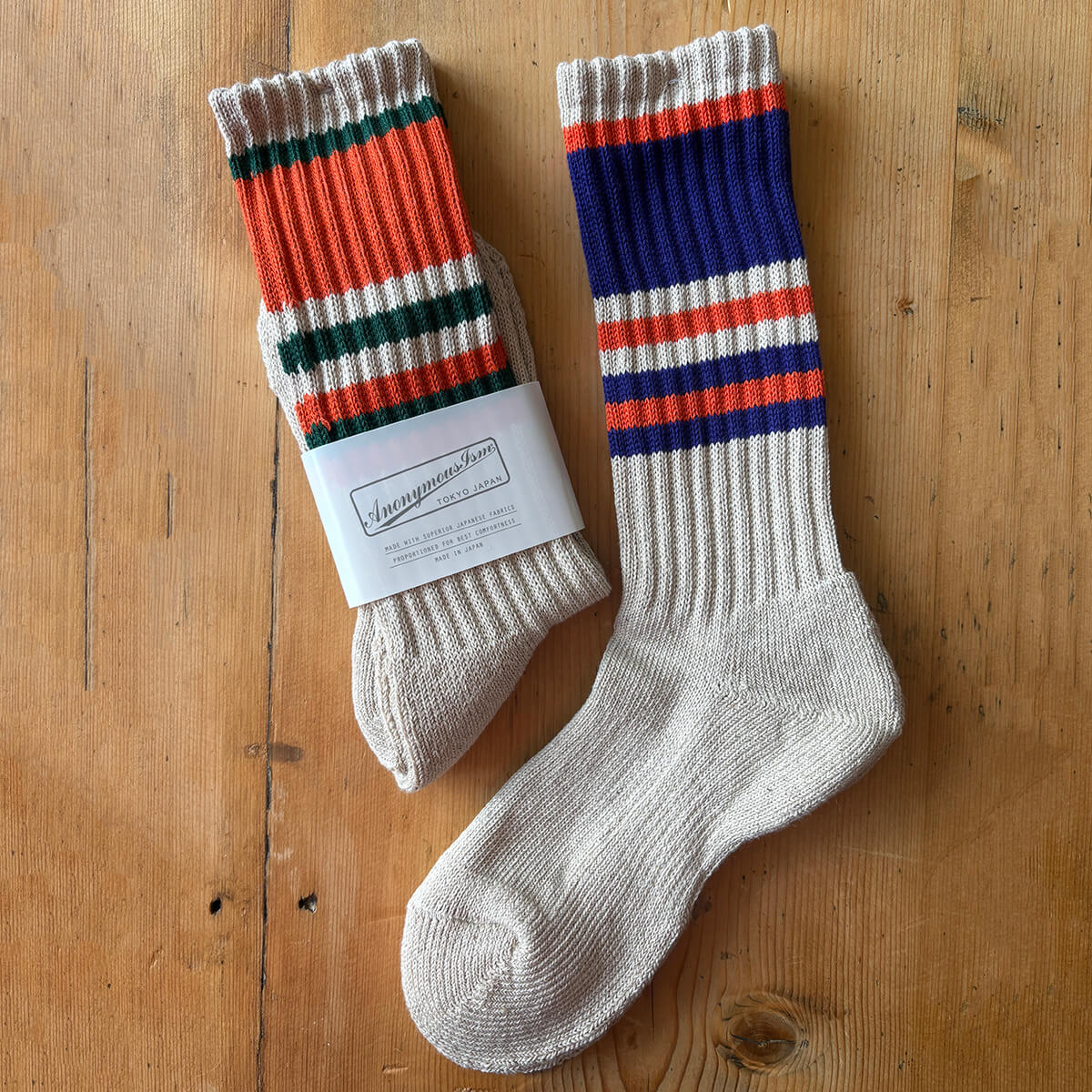 Hemp Random Stripe Pile Crew Adult Socks by Anonymous Ism. Chunky ribbed sport socks crafted from high hemp content yarn, offering a unique twist on the classic design with random, eye-catching lines that set them apart. Knitted on a low-gauge machine, they feature a relaxed, soft, and highly stretchable fabric for exceptional comfort. The sole is pile-knit, which gives a bouncy feel, providing excellent cushioning and a superior wearing experience. Hemp is a natural material offering outstanding features such as moisture absorption, quick drying, and odour resistance, making these socks as functional as they are stylish.