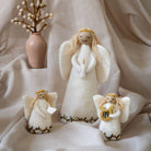 Embroidered angel holding a book by Gry & Sif. A beautiful handmade angel in a Scandinavian style holds an open book, as if singing Christmas carols. Handcrafted with delicate embroidery, she adds warmth and harmony to your holiday decor. Handmade and truly unique. Other Nativity items to complete your Christmas scene are sold separately.