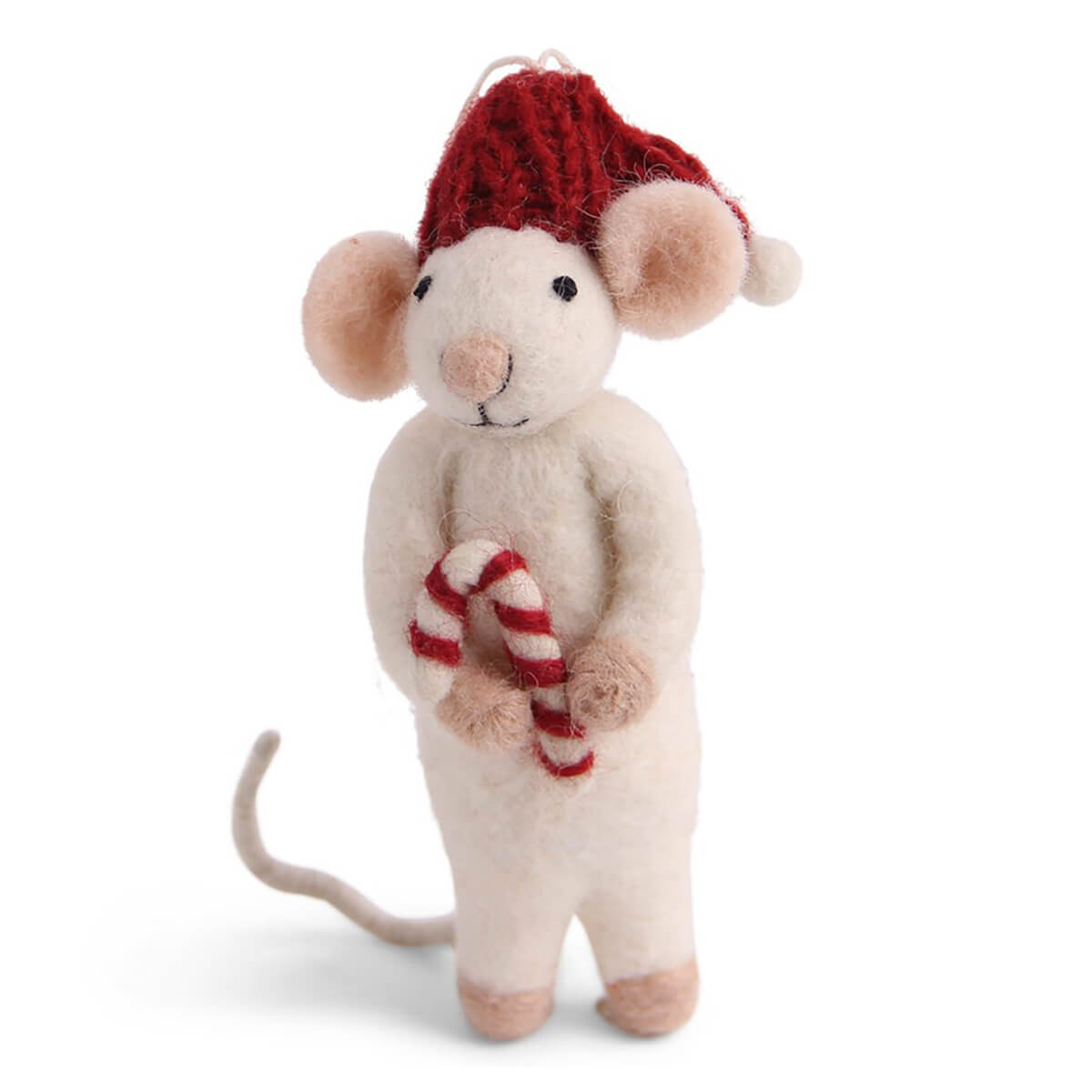 White mouse with candy cane hanging Christmas decoration by Gry & Sif. A beautiful soft felted Christmas decoration in a Scandinavian style. Handmade and truly unique. Suitable for hanging from the Christmas tree, dangling from foraged branches or displayed in your window for a hygge Danish Christmas.