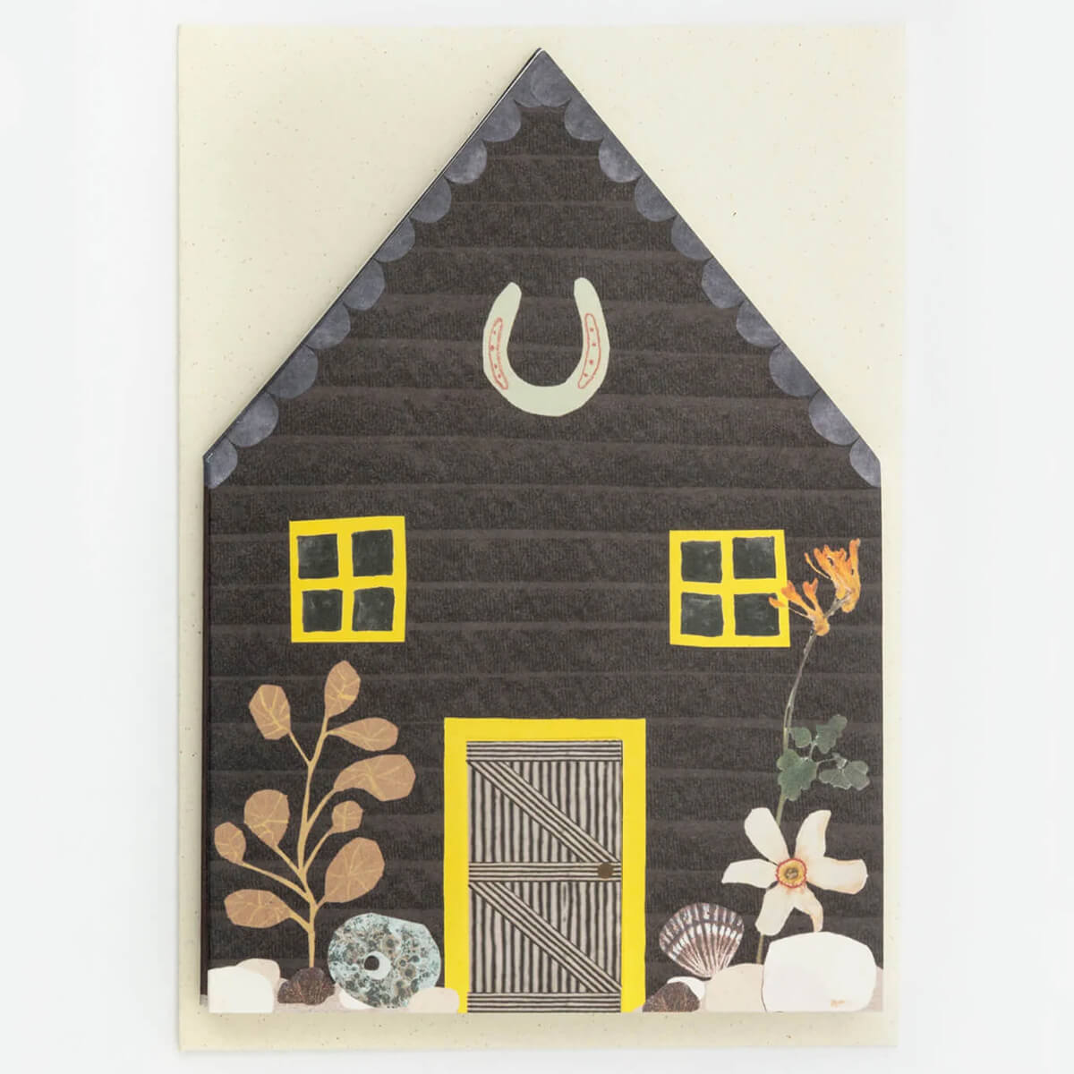 Fisherman's Huts Concertina Greetings Card by Hadley. Featuring six fisherman's huts, each unique in its design with gorgeous attention to detail such as fish, shells, baskets and plants. Designed using a classic combination of oil pastels, badly pressed flowers, cut outs from a book about fisherman's jumpers and marbling. Perfect for displaying in a window, on a mantel piece, shelf, or on the wall. A lovely greetings card for lovers of the beach, fishing, holidays, nautical themed things, and getting nostalgic about the good old days. For extra fun, the little doors open!