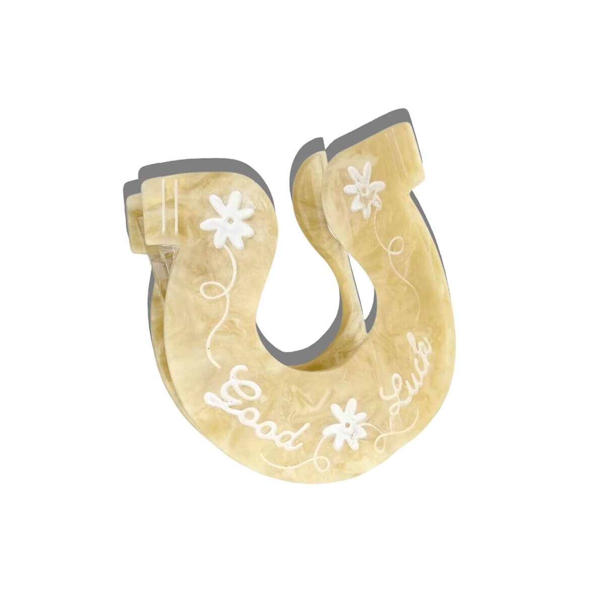 Good Luck Horseshoe Hair Claw by Solar Eclipse. Hand-painted by the Solar Eclipse artists, this original good luck horseshoe claw clip is crafted in small batches. It's designed to upgrade your routine and be treasured for years to come. Designed in New York City, this clip is double-sided, for a perfect look from all angles. Crafted from eco-friendly cellulose acetate, a sustainable and biodegradable material made from recycled wood pulp, this clip offers both beauty and responsibility.