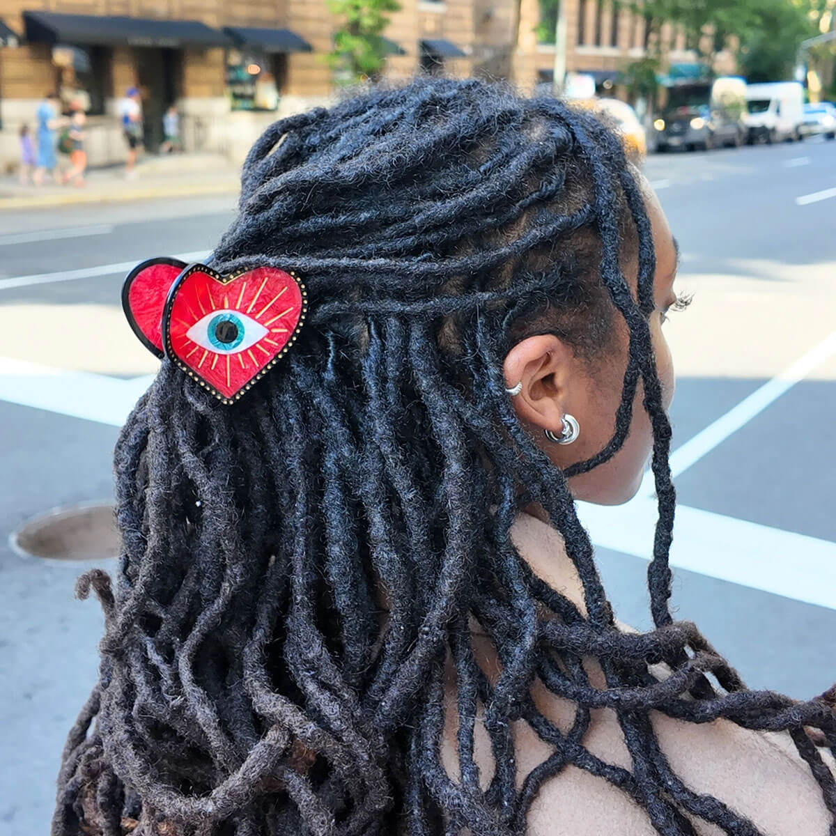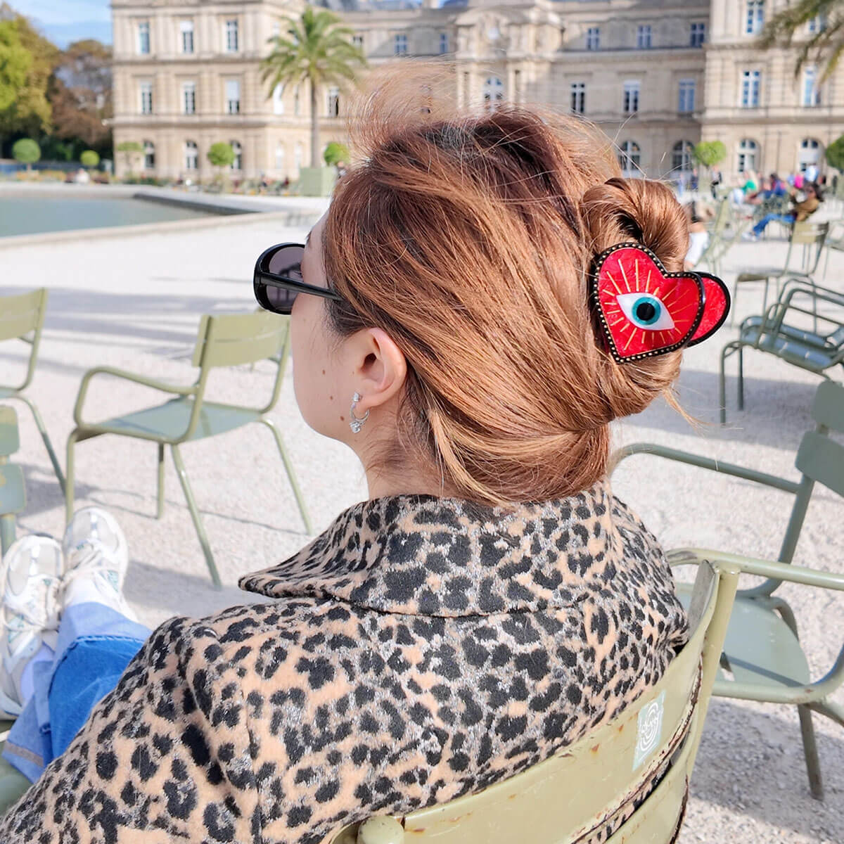 Lucky Eye Heart Hair Claw by Solar Eclipse. Hand-painted by the Solar Eclipse artists, this original lucky eye heart claw clip is crafted in small batches. It's designed to upgrade your routine and be treasured for years to come. Designed in New York City, this clip is double-sided, for a perfect look from all angles. Crafted from eco-friendly cellulose acetate, a sustainable and biodegradable material made from recycled wood pulp, this clip offers both beauty and responsibility.