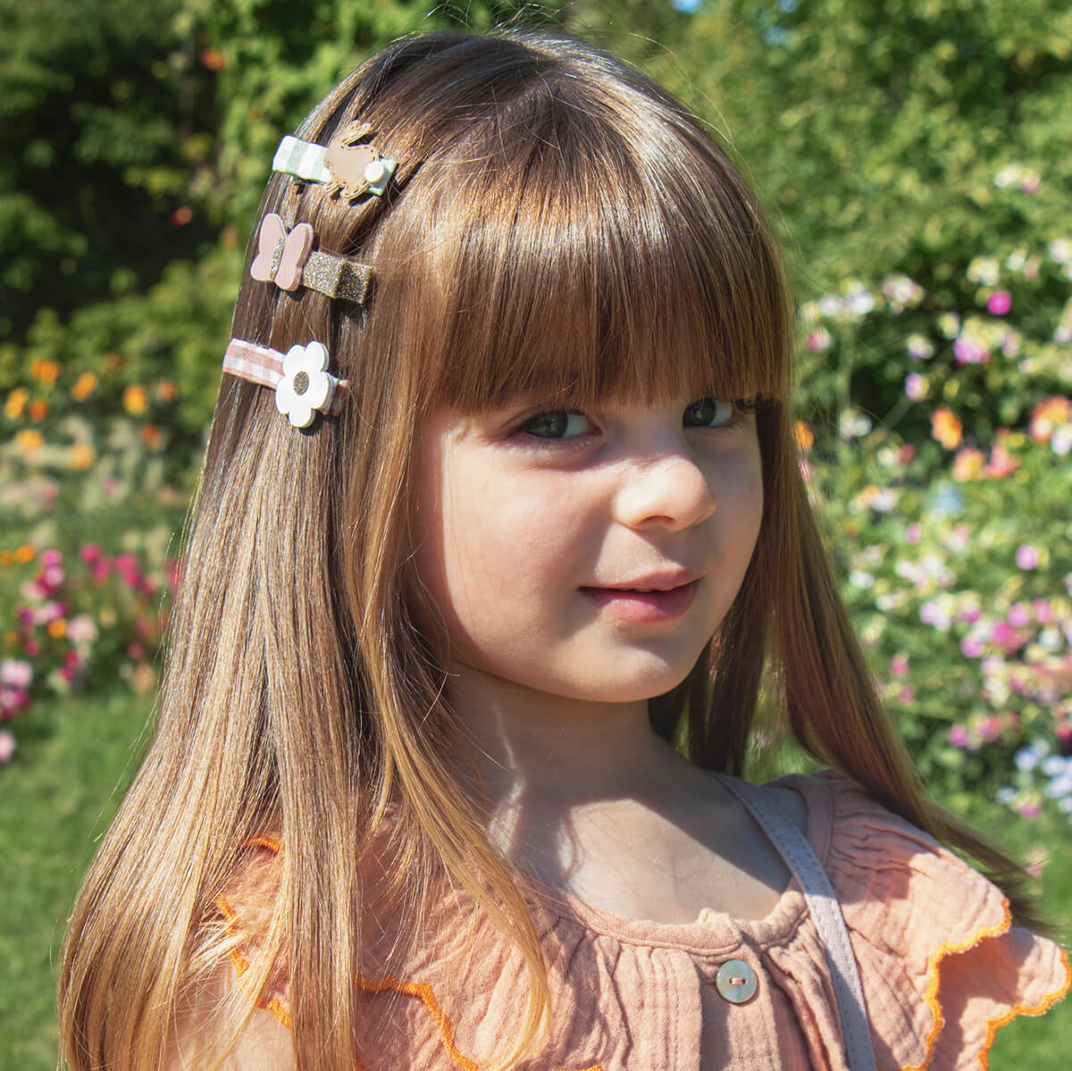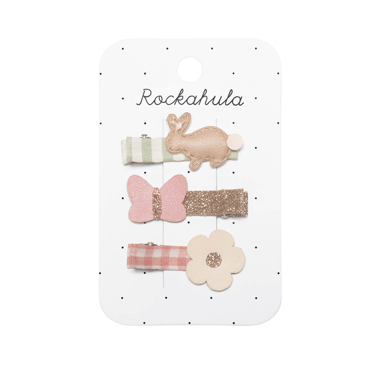 Springtime Bar hair clips by Rockahula Kids. Celebrate the start of the season with these Springtime bar clips. A pack of three bar clips each adorned with a springtime essential: A hopping PU bunny, a pink butterfly with a golden body and sweet daisy flower - wear them one at a time or all at once!