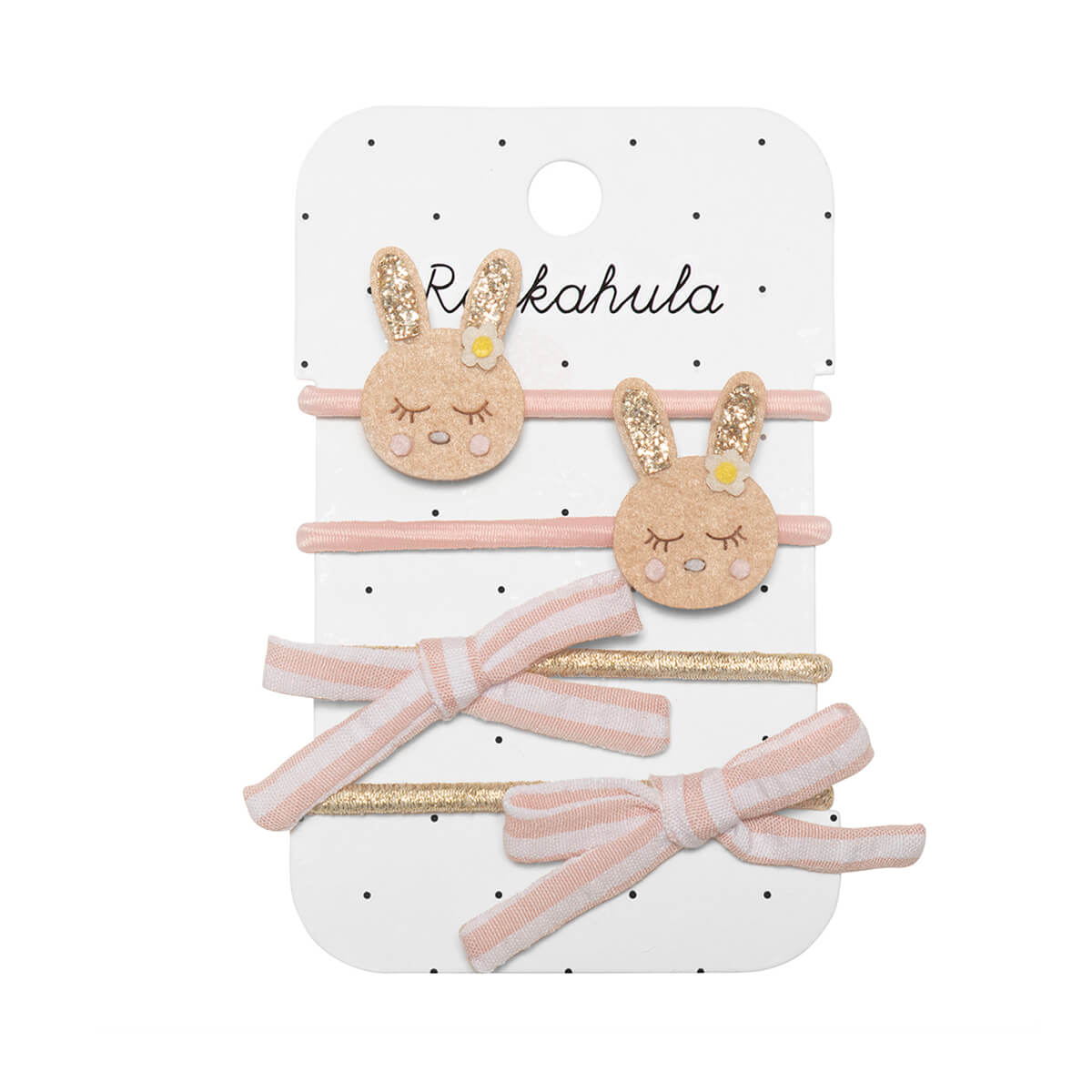 Stripy Bunny set of pony tail bands by Rockahula Kids. Hop into style with our adorable Stripy Bunny Ponies! Each tie features a charming bunny face adorned with glittery ears and a sweet daisy in her hair, bringing a touch of whimsy to your hair accessories. The playful stripy bows add a pop of colour and a fun twist..