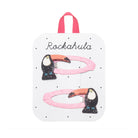 Tina Toucan hair clips by Rockahula Kids. The brightest little toucans adorn these cute clips. Each toucan is delicately detailed with a glittering black body and bright red beak and are set upon a pink grosgrain ribbon wrapped snap clip.