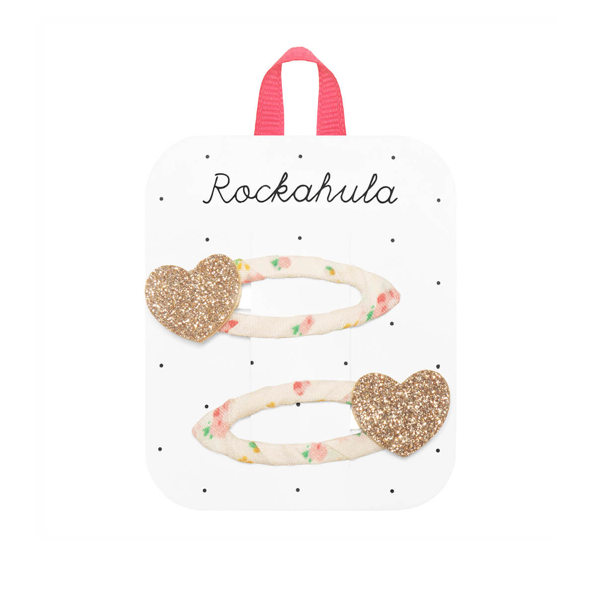 Tiny Blossom Glitter Heart Hair Clips by Rockahula. A pack of two gold glittery hearts, set upon pretty tiny blossom ribbon wrapped snap clips. These glittery heart shaped clips are loveable in every way!