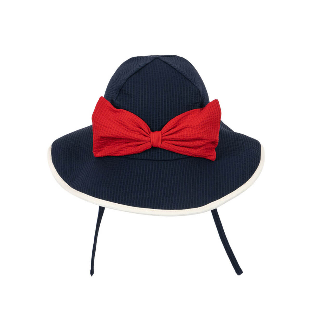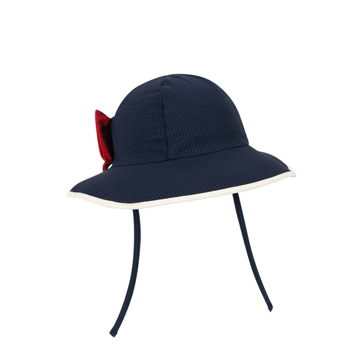 Bowie Swim Hat by Konges Sløjd. Swim hat in soft seersucker fabric with a padded brim. Designed with a decorative bow. Fasten the sun hat with strings under the chin for a comfy fit. The Bowie swim hat protects against the sun’s UV rays with the highest ultraviolet protection factor, UPF 40+.