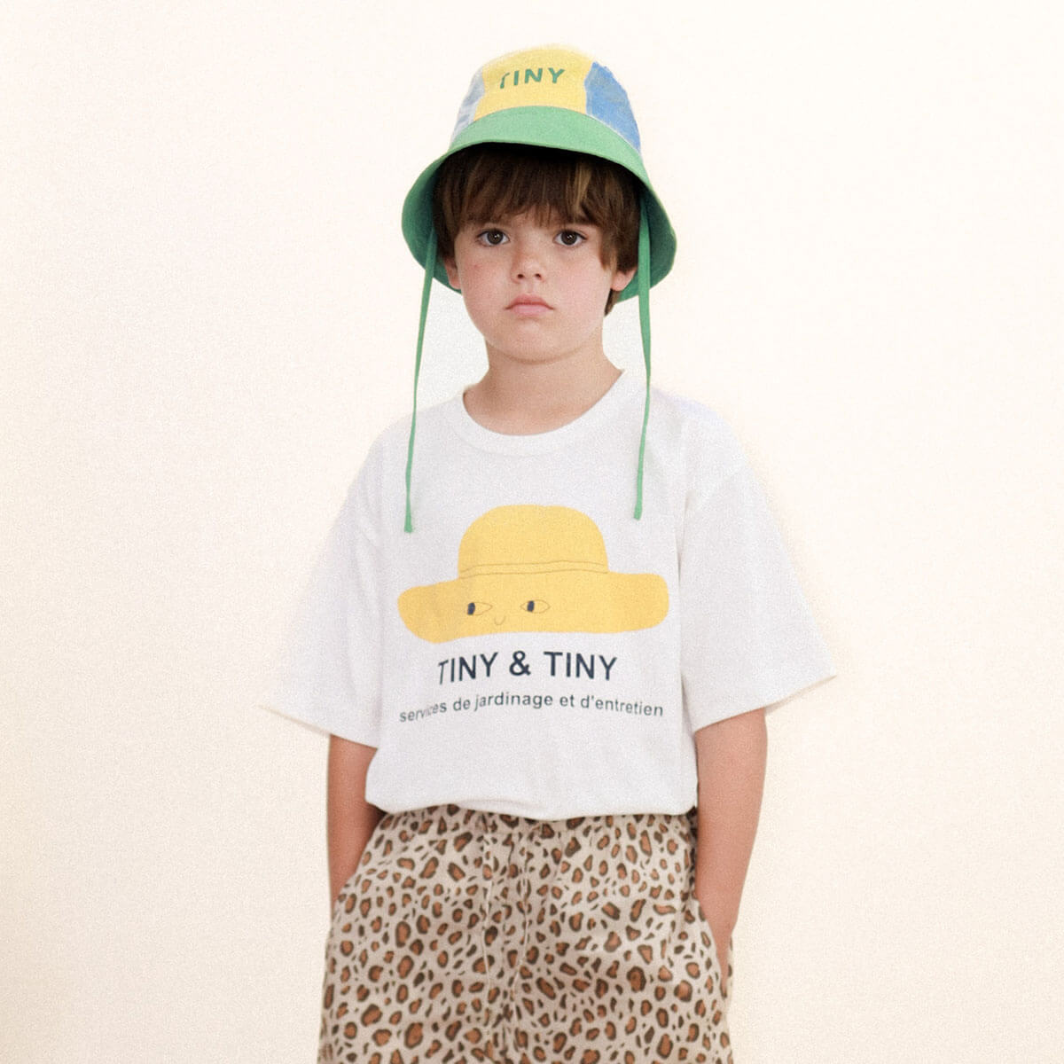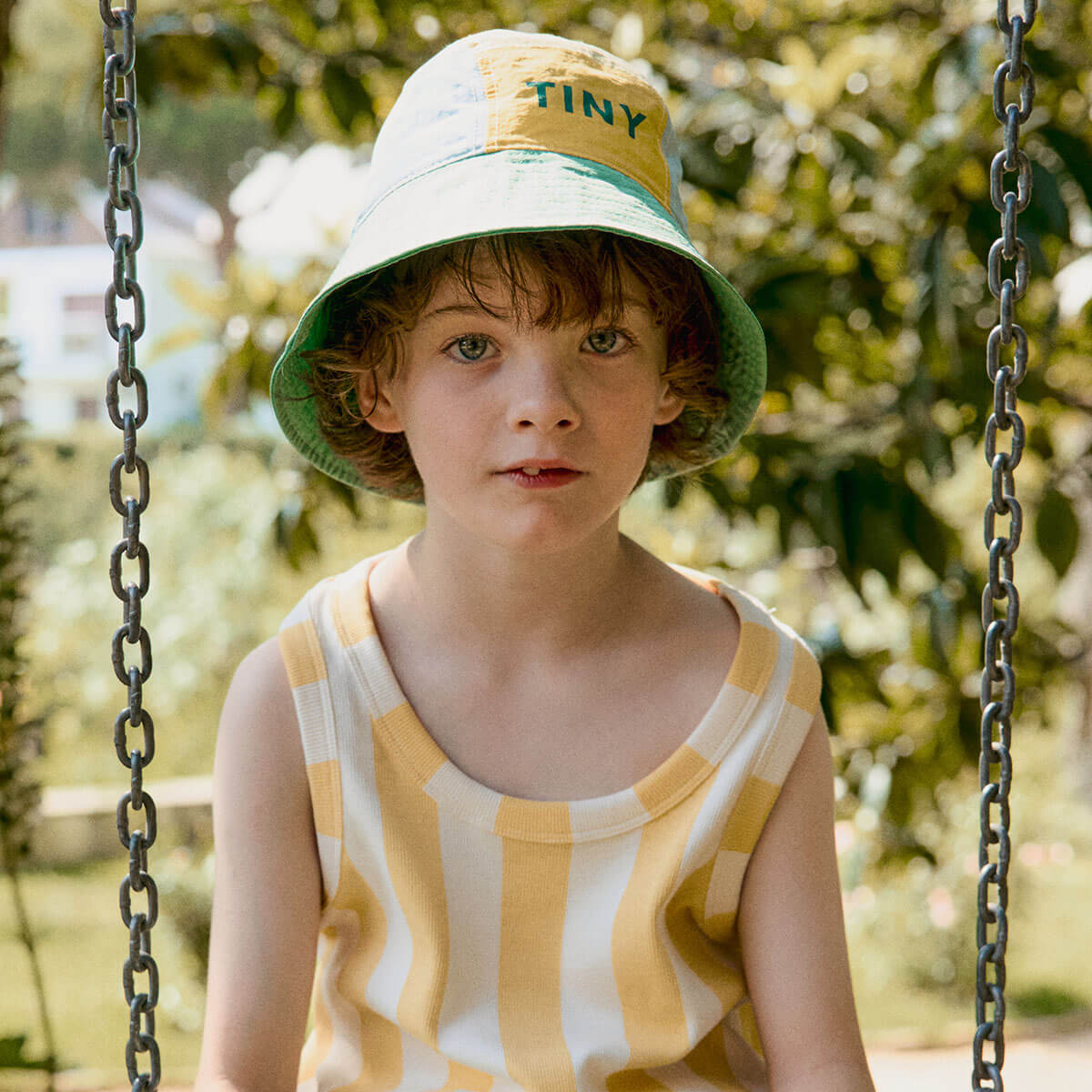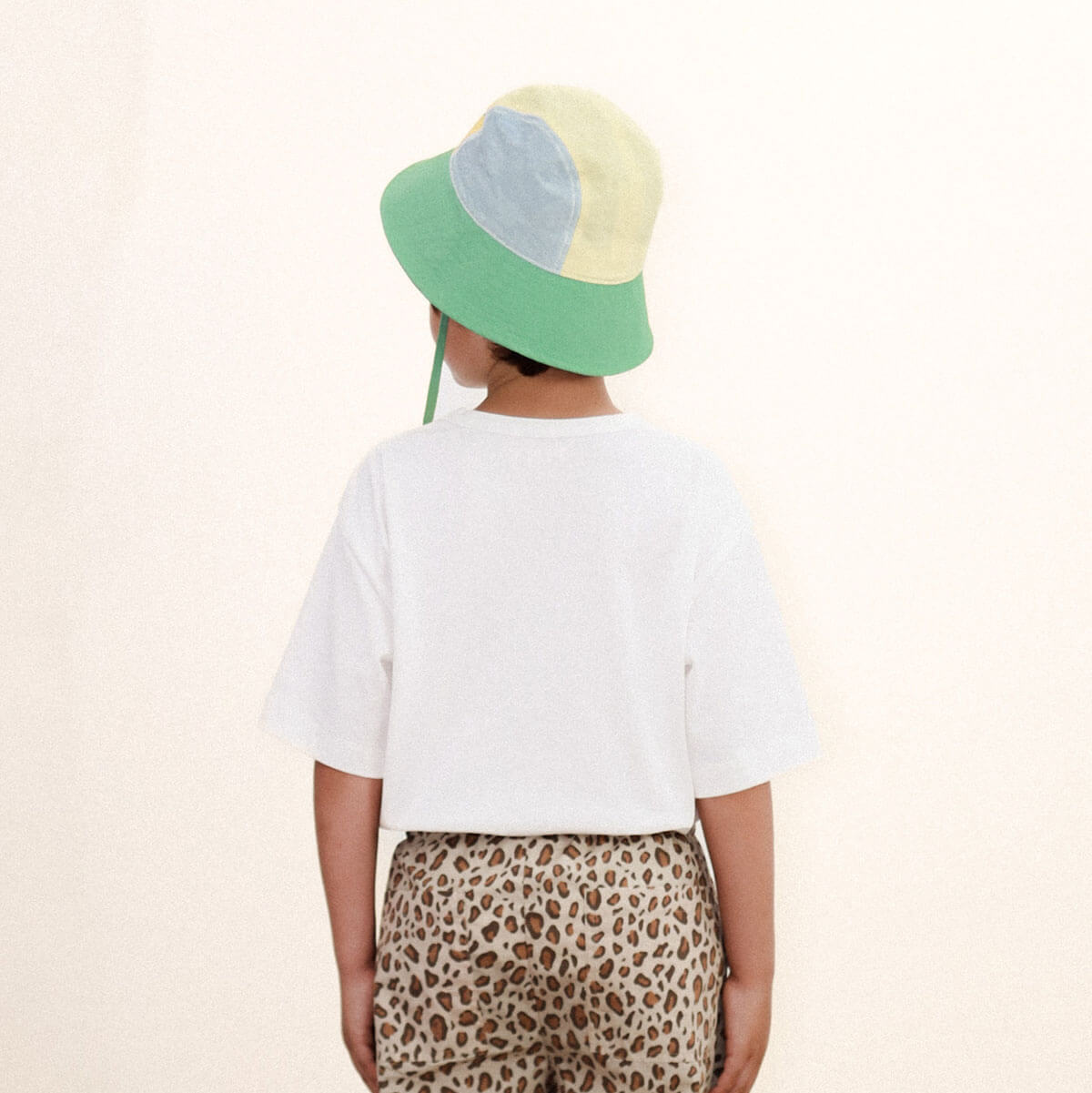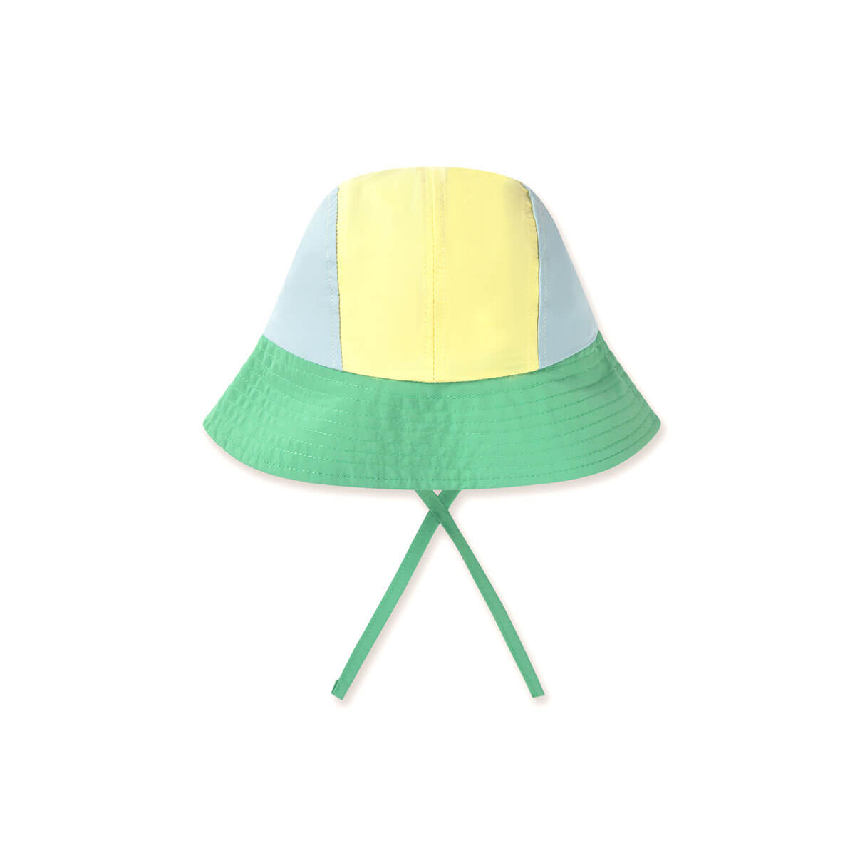Colour Block Bucket Hat by Tinycottons. A timeless style with a unique twist, this bucket hat features a yellow, blue, and emerald colourblock design, crafted from soft crinkled fabric and finished with matching fabric ties for adjustment. A small front logo print adds that signature Tiny touch. Perfect for sunny days, it blends classic style with everyday practicality.
