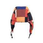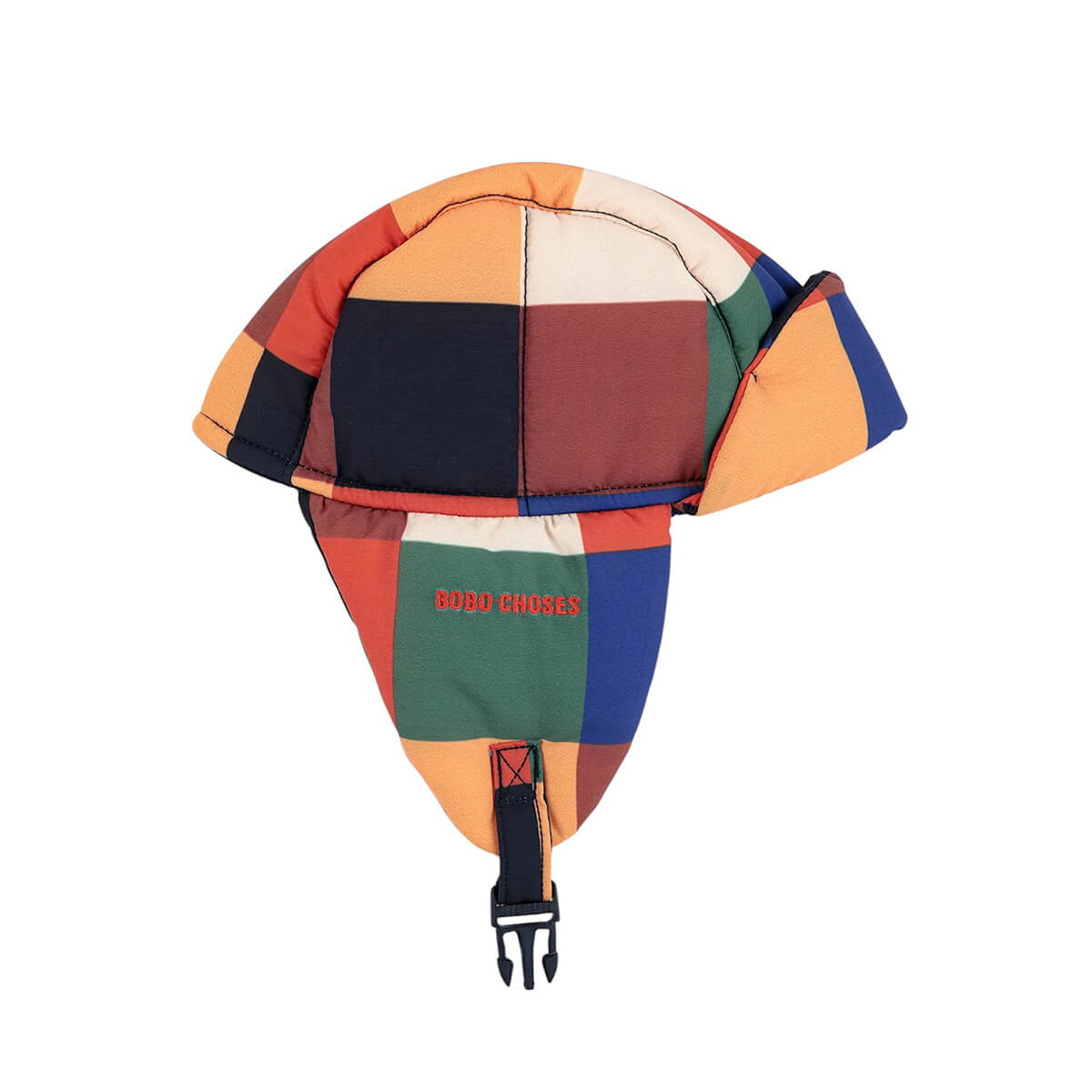 Multicolour Tiles Chapka by Bobo Choses. A padded winter hat with a fold up brim and snap closure under the chin.