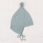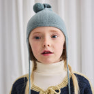 Pointy Peak Hat by Misha & Puff. A hand-knit hat in Merino wool, with ear flaps, a stand-up pointy pom-pom top, and popcorn tie closure for a secure fit.