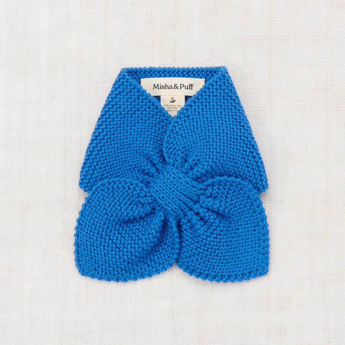 Sledding Scarf by Misha & Puff. A hand-knit scarf in Merino wool, with a pull-through kerchief closure. Can be worn as a hood or over a hood to keep hoods in place — the perfect complement to any outfit.