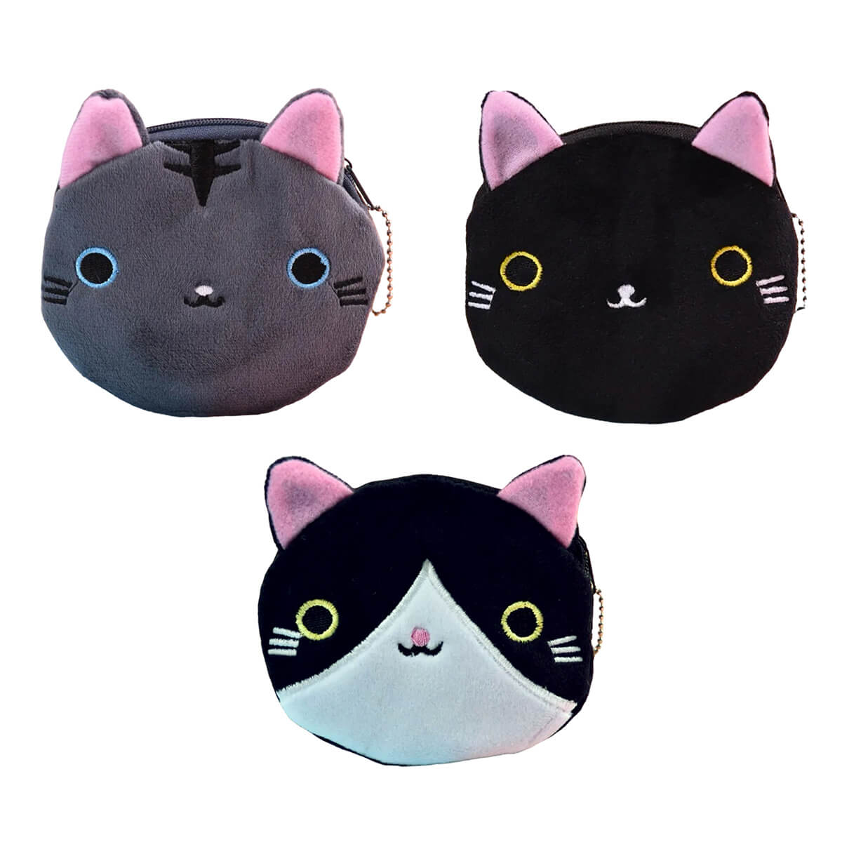 Velour Cat Purse by Hello Sakura. Say Meow to the cutest velour cat coin purse. With a zip closure and sweet embroidered cat face. Choose from 3 colours; Black, Grey and Tuxedo Cat.