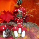 Toadstool Fairy felted hanging decoration by Felt So Good. Hand needle felted decoration, featuring an autumnal Toadstool fairy with a red wet felted toadstool skirt and matching hat upon her brown, wool hair.