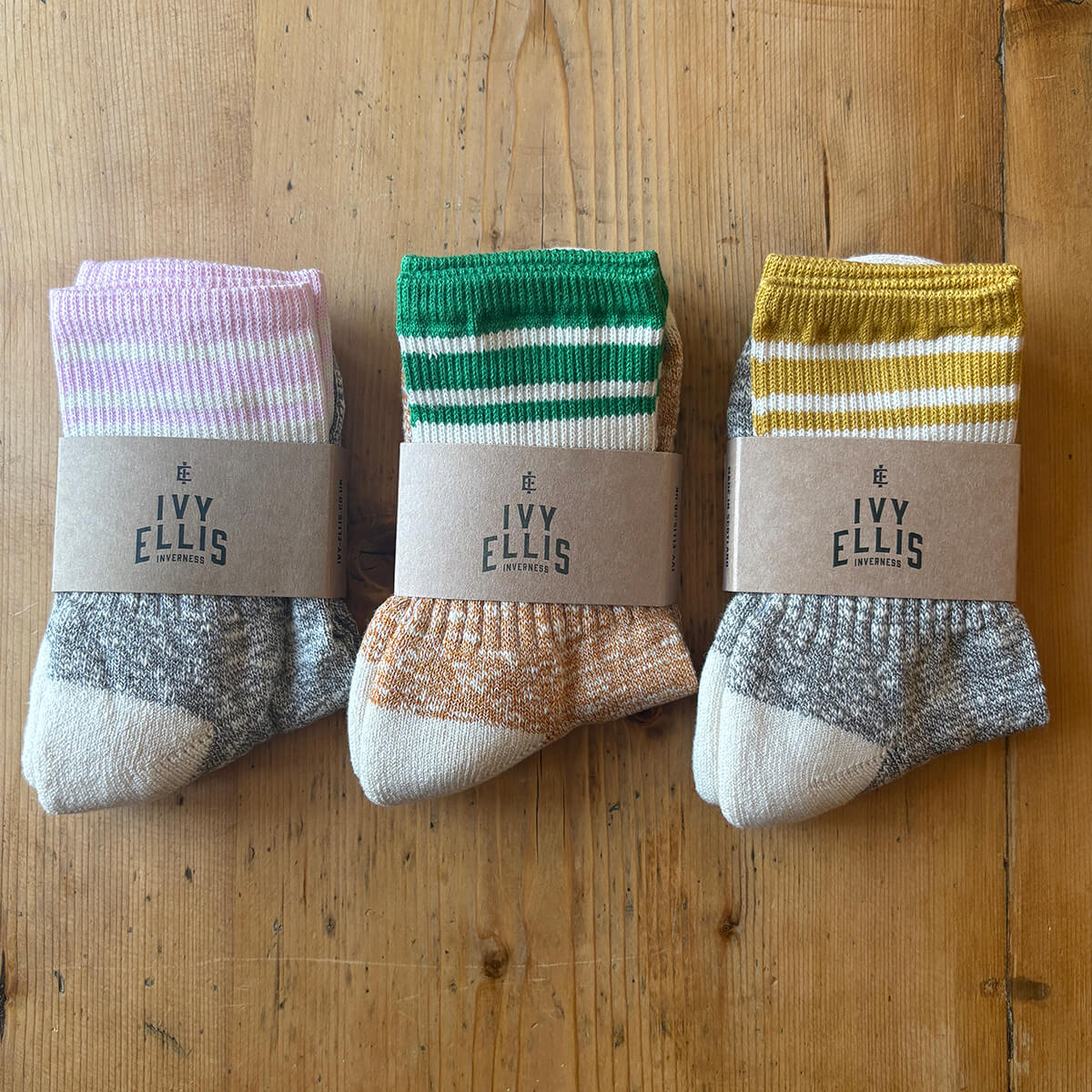 At Ivy Ellis, striped socks are more than just an accessory – they are a celebration of heritage, craftsmanship, and timeless style. Ivy Ellis started in 2020 as a little side project during lockdown, drawing inspiration from growing up in the 80s and American sportwear, varsity fonts and colourways from Ivy League universities. Every pair of Ivy Ellis socks are designed in the UK and crafted in a small, family run factory in the Scottish Highlands. Ivy Ellis make small runs of each design, operating sustainably and making a lasting, quality product. Whether you’re drawn to bold, vintage sports colours or understated preppy Ivy League shades, Ivy Ellis offers a curated collection of striped socks that combine heritage style with modern craftsmanship. Explore the collection today and find the perfect pair to suit your style.