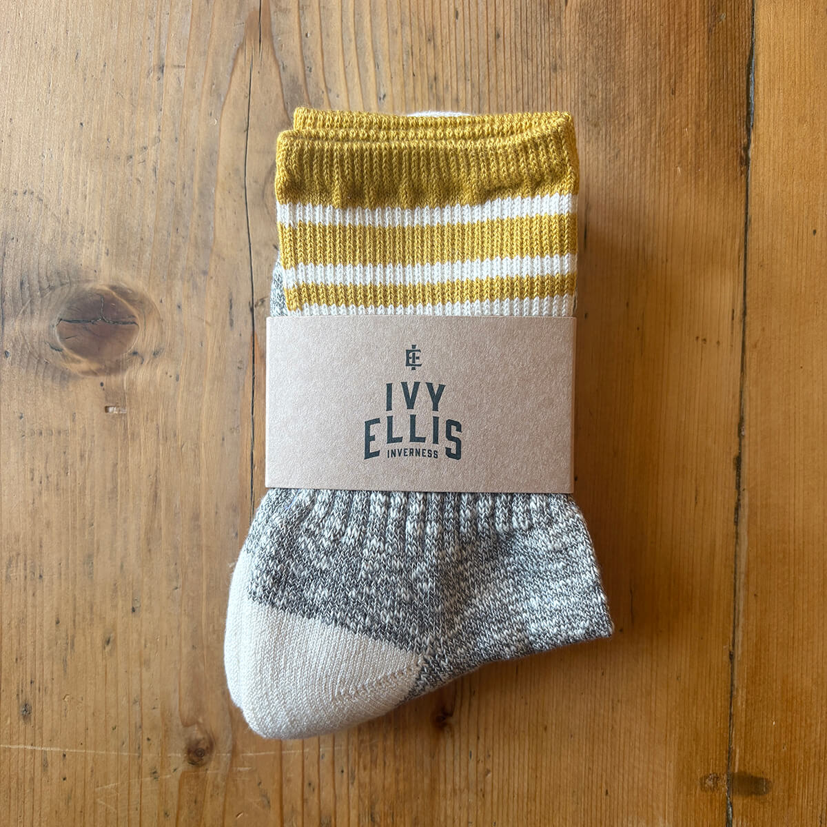 The Sinclair women's highland coastine slub socks by Ivy Ellis. Handcrafted with care, The Sinclair socks are made from ribbed light grey slub yarn, providing a unique texture and visual appeal. Featuring a signature vintage cream heel and toe, these socks are finished with a soft elasticated top with mustard stripes for extra hold, ensuring they stay in place comfortably throughout the day.
