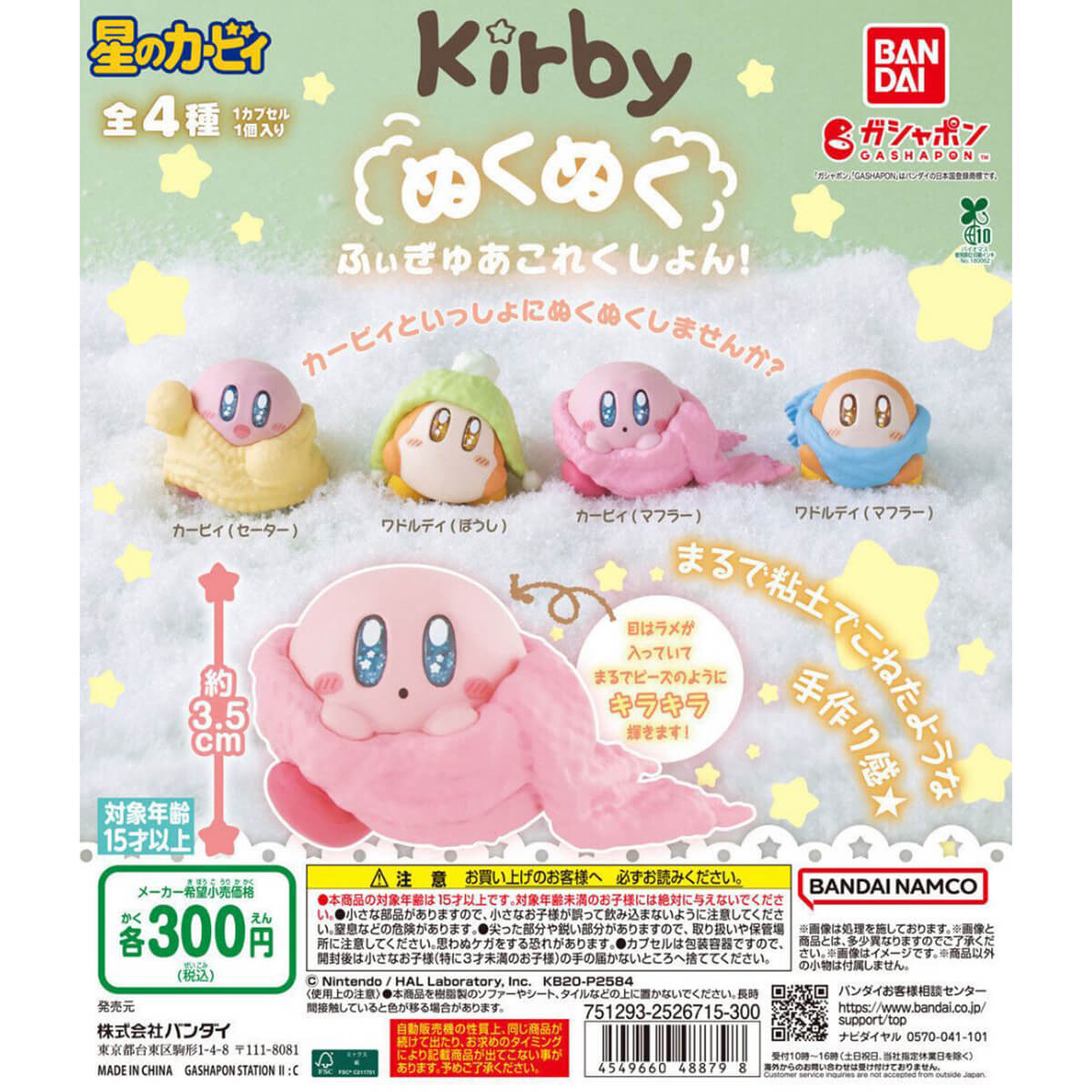 Kirby Cosy Winter Gachapon Capsule Collectible by Bandai. Highly collectible and authentic Japanese gachapon capsule containing one of four Kirby characters wrapped up in cosy blankets. These miniature figures have a hand made feel and intricate detailing on the sparkly eyes.