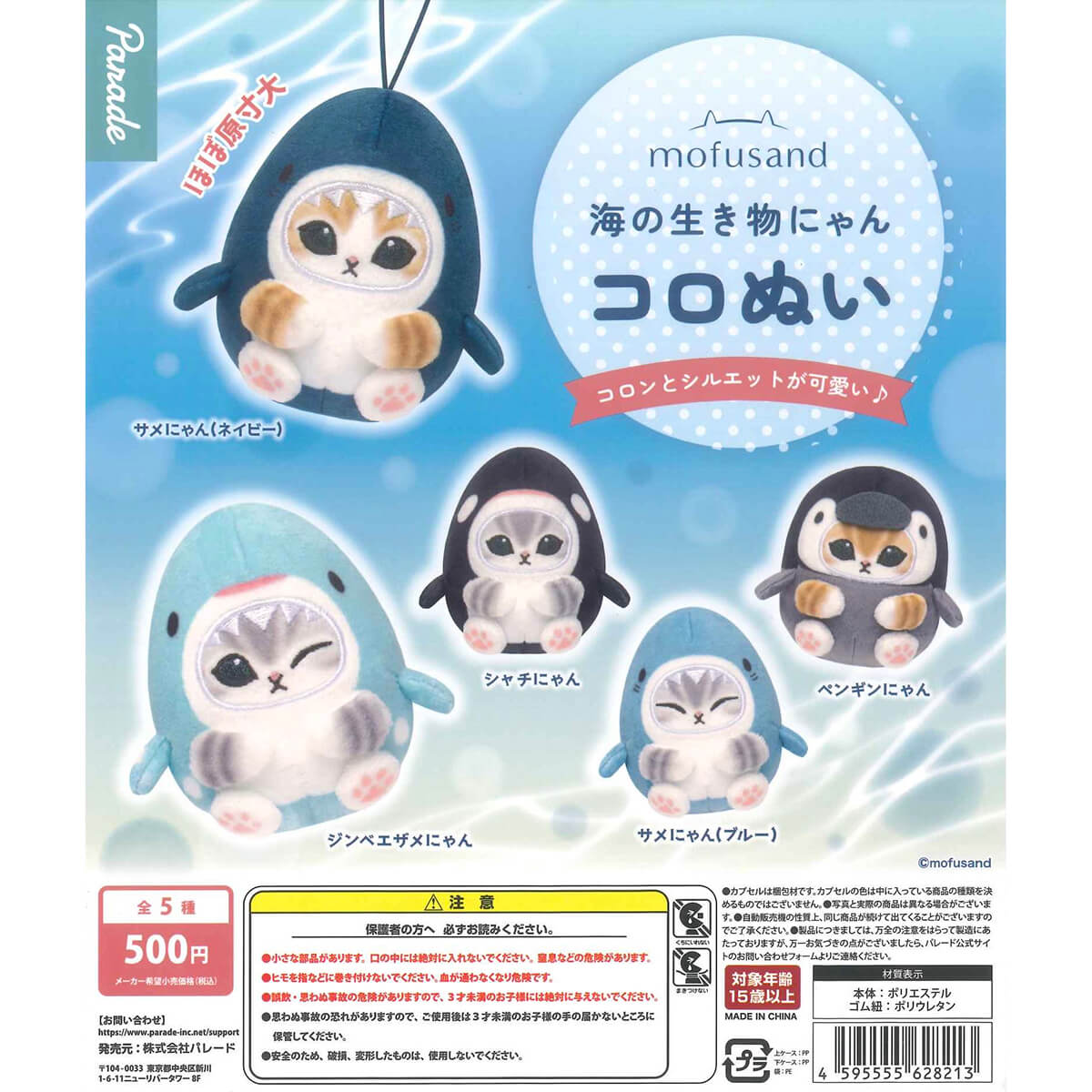 There are six different plush Mofusand cats in this Gachapon series: Shark (Navy) Shark (Blue) Orca, Whale Shark and Penguin.