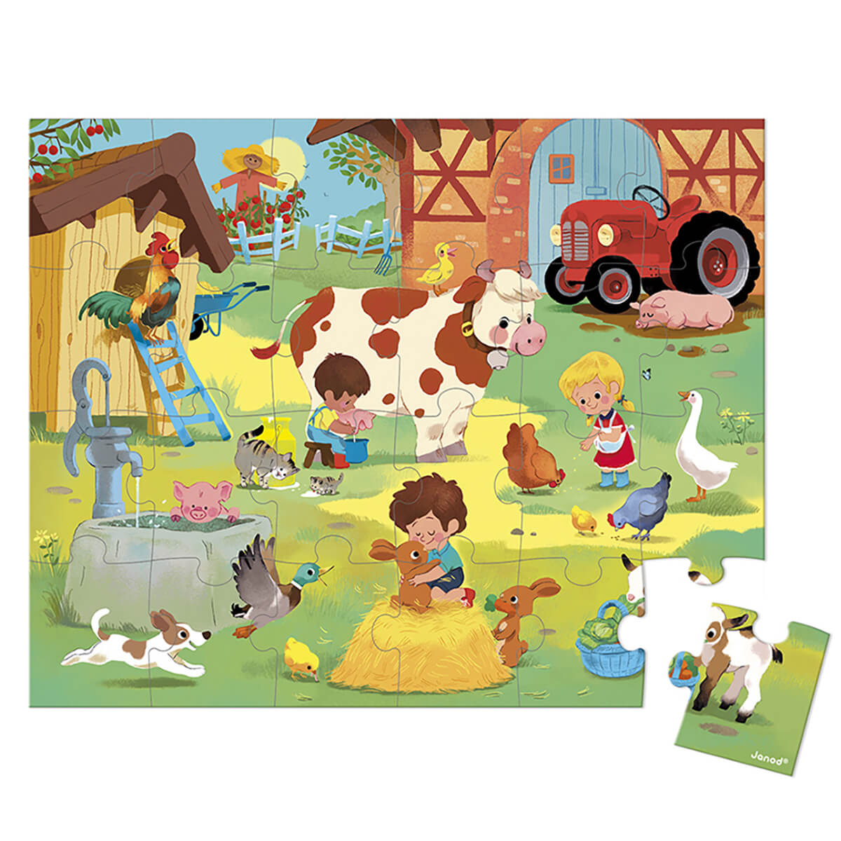 A day at the farm puzzle by Janod. Ready for a trip to the farm? A tractor, a host of animals and a lot of funny details await your child for an entertaining and fun activity. Find the farm animals in this 24-piece cardboard puzzle. The pieces are suitable for the hands of children from 3 years old, for easy handling! What is this animal ? What are the little rabbits doing? A fun way to develop young children's memory and dexterity. This lively puzzle comes with a poster as a template, so you can put the puzzle together at your own pace. Comes in a pretty case with handle, for easy storage of the pieces and transport.
