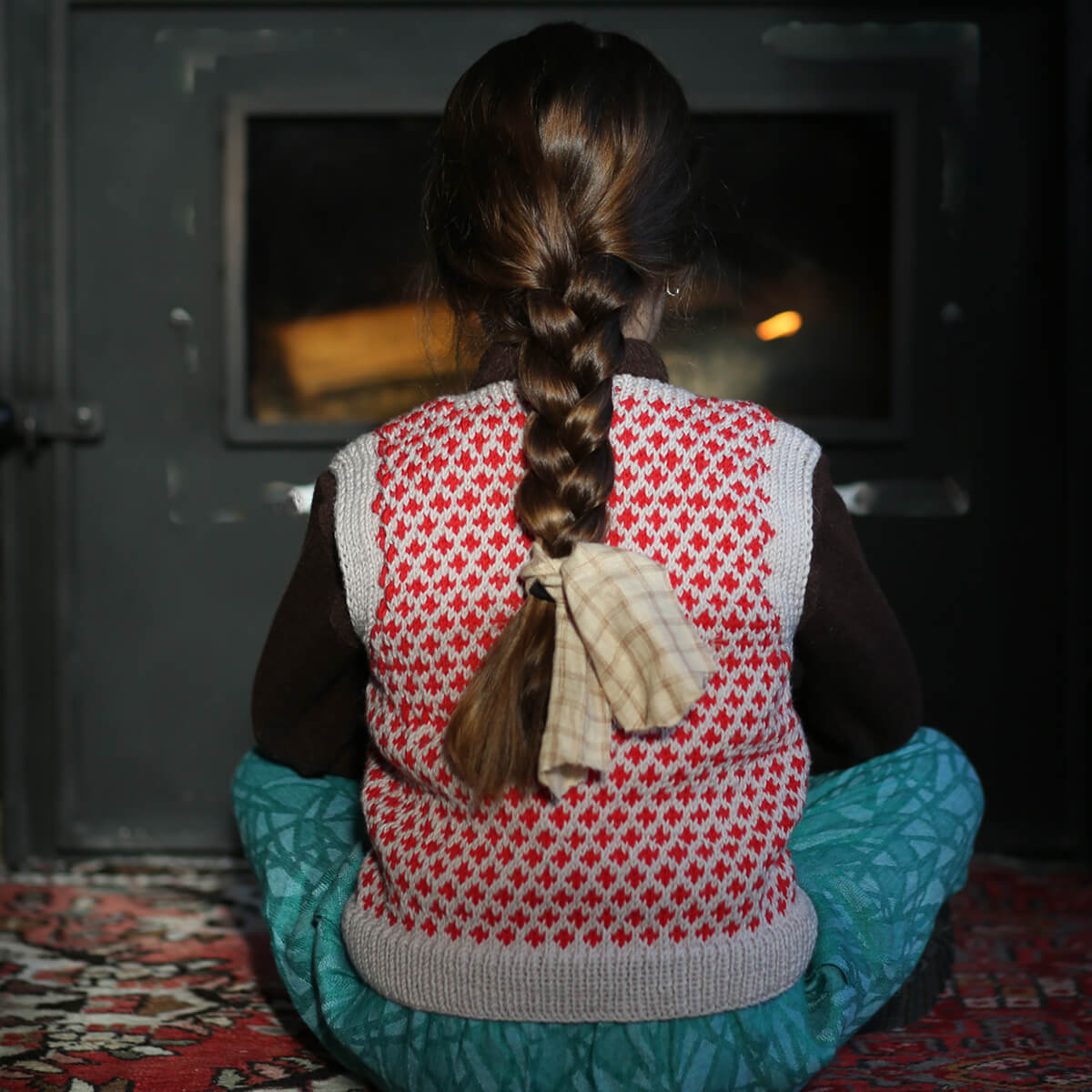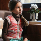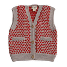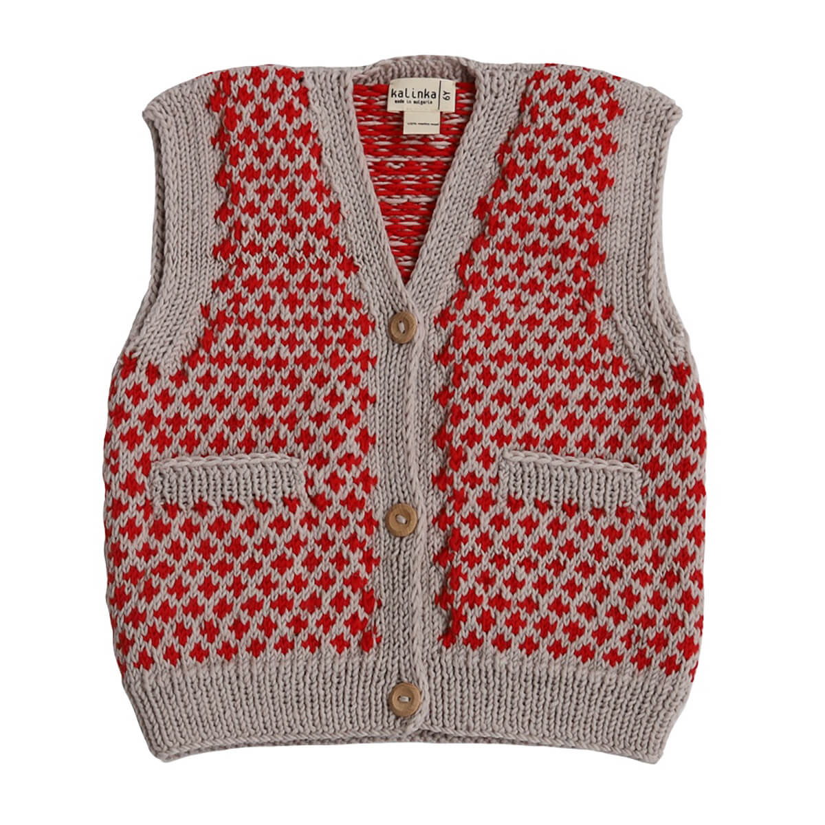 Edmund Vest by Kalinka. A classic knit sleeveless cardidan with a pretty all over pattern and wooden button closure.