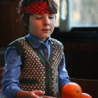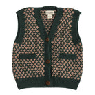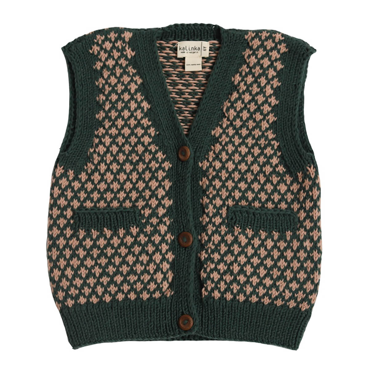 Edmund Vest by Kalinka. A classic knit sleeveless cardidan with a pretty all over pattern and wooden button closure.