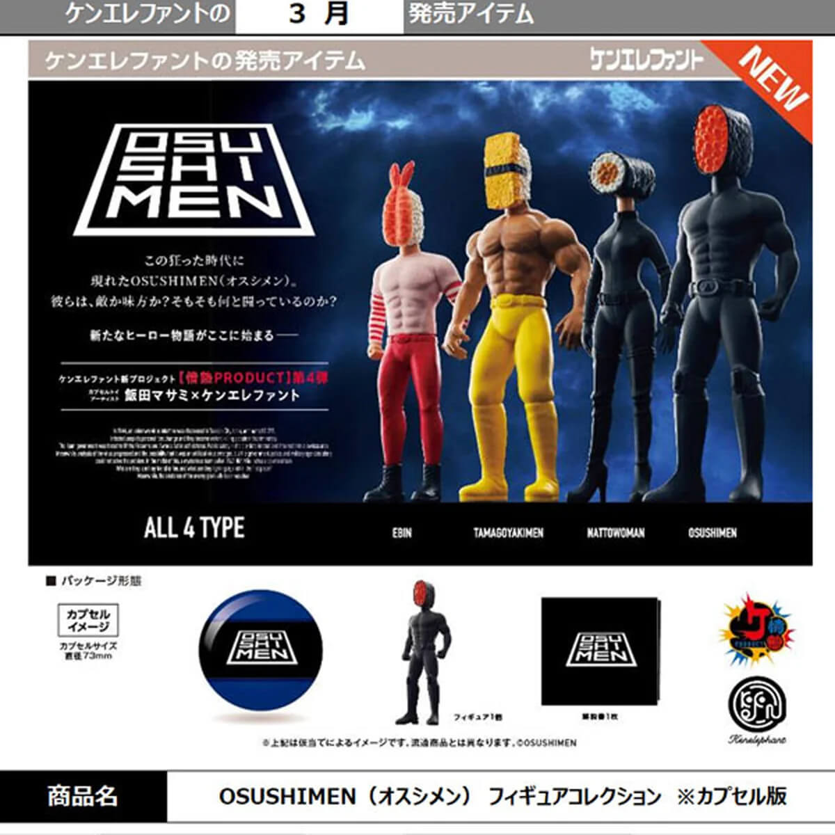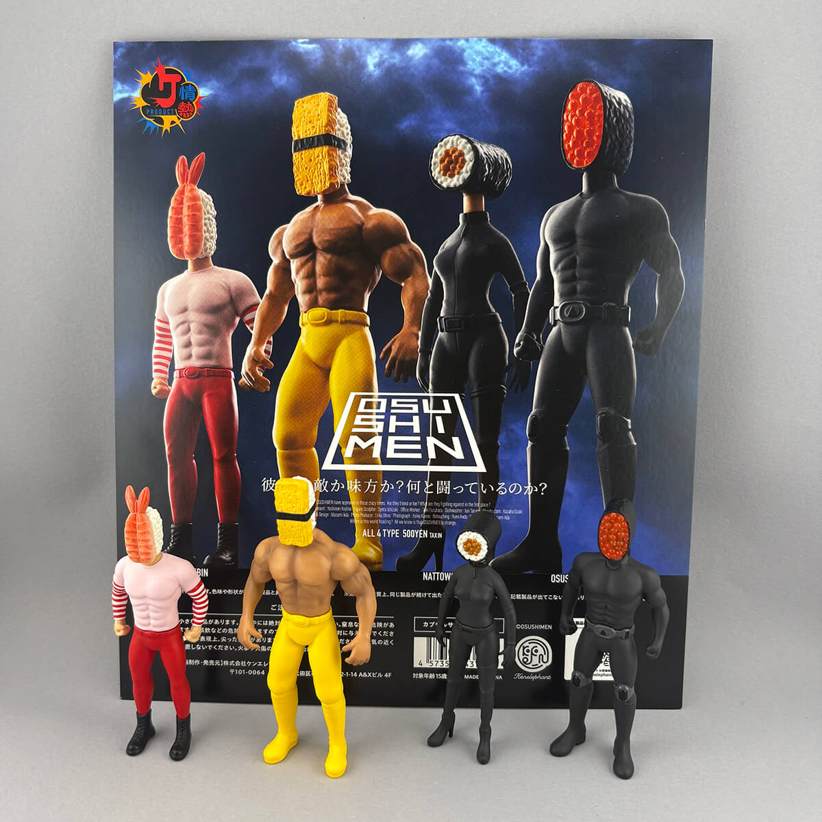 There are four different Osushimen figures in this Gachapon series: Osushimen Leader (Ikura), Nattowoman (Natto), Tamagoyakimen (Tamago) and Ebin (Prawn).