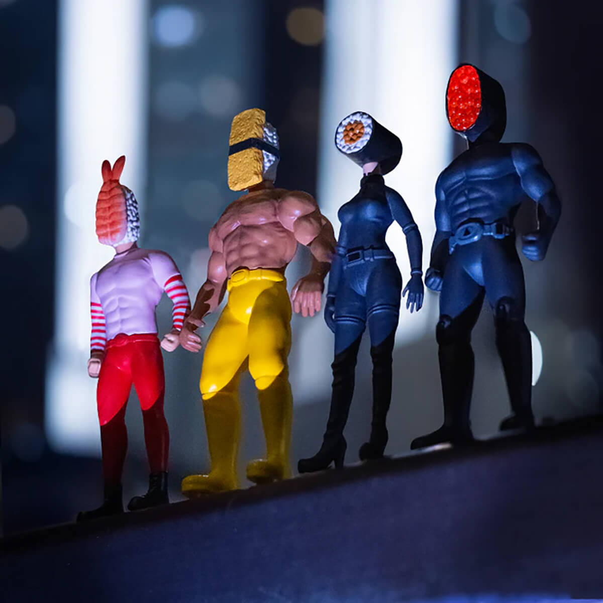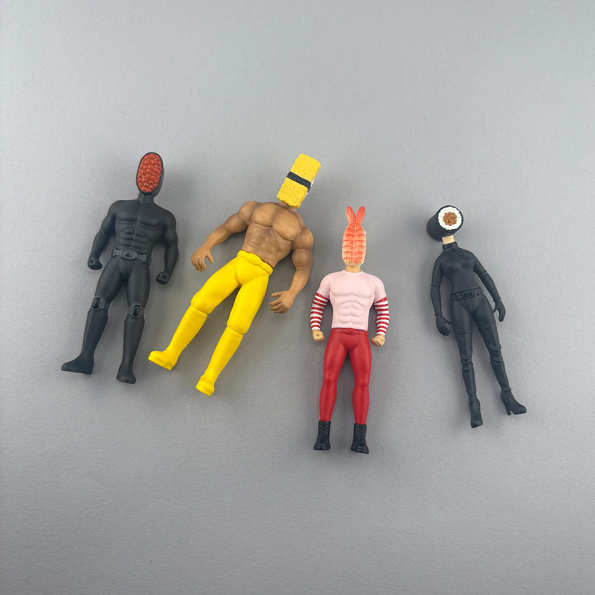 1. Osushimen - the team's leader, is stoic and has an extremely strong sense of justice, but sometimes goes too far and causes trouble. His special move is the Ikura Gatling, which fires salmon roe at the face repeatedly.