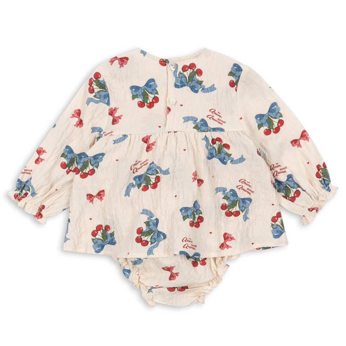 Elin Romper by Konges Sløjd. Romper in a soft and crinkled seersucker fabric with gatherings at the wrists. Features buttons at the leg openings for easy dressing.